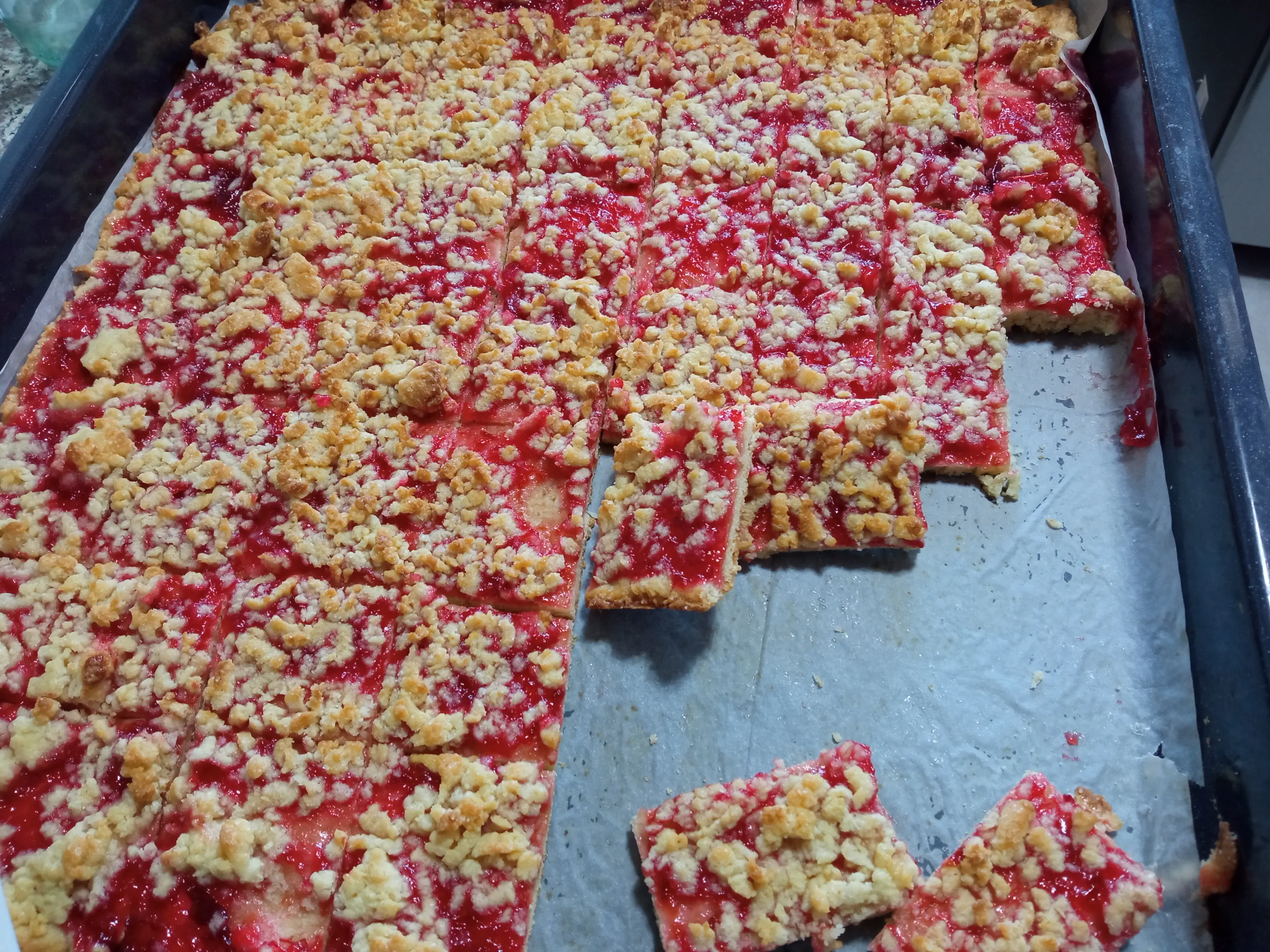 לשטח עם מערוך על נייר אפיה 2/3 מהבצק. למרוח רחבה ולגרד מעליה עם פומפיה את שארית הבצק. לאפות 20-25 דקות על 180.