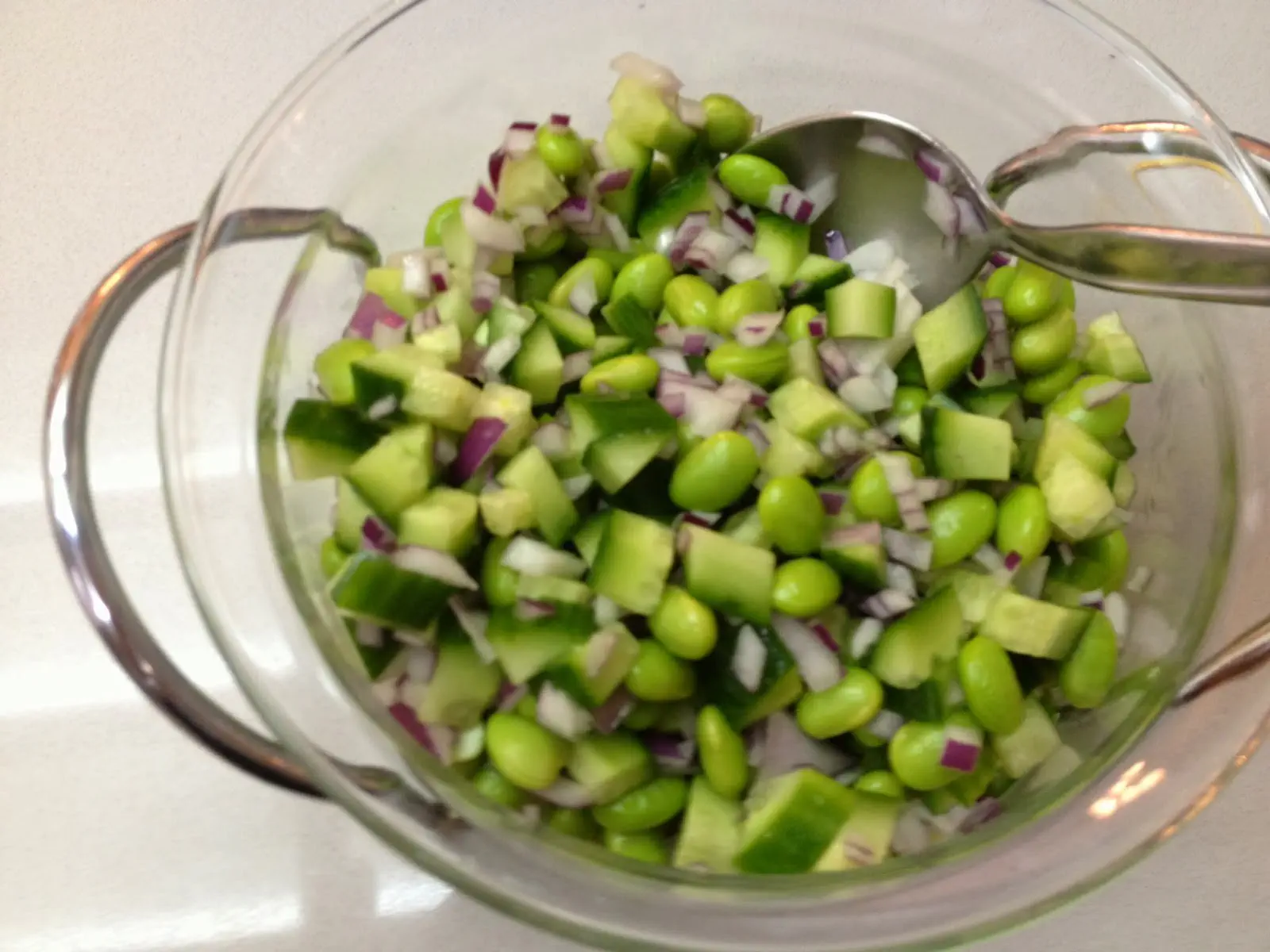 מבוסס על פולי סויה מבושלים(אדממה), צנוניות, עגבניות שרי, שומשום קלוי ופטרוזיליה