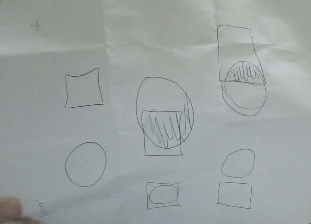 נסיה לוקח עט כחול ומציירת ביציבות ריבוע פשוט, בתוכו היא מציירת עיגול. ליד היא מציירת ריבוע ועיגול שהחלק מהשתוף שלהם גדול, מתחת עוד ריבוע ליד עיגול שהחלק המשותף בינהם קטן וליד ריבוע ועיגול לא משיקים.