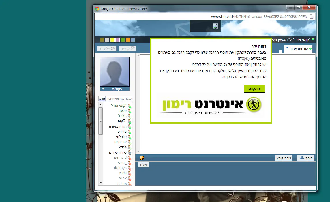 <! DOCTYPE html PUBLIC "-//W3C//DTD XHTML 1.0 Transitional//EN" "http://www.w3.org/TR/xhtml1/DTD/xhtml1-transitional.dtd"> < html dir="rtl" xmlns="http://www.w3.org/1999/xhtml"> < head><title>בעיה.. חלון שלי רימון חוסם לי את הש"א, - משוב - טכני - פורומים - ערוץ 7</title> <meta name="Description" content="מישו יודע איך מתקנים את זה? 20130404175107.png תודה רבה! נ.ב לא בא לי"/><meta property="og:site_name" content="ערוץ 7"/> <meta property="og:image" content="http://a7.org/pictures/50/50257.jpg"/> <meta property="og:title" content="בעיה.. חלון שלי רימון חוסם לי את הש"א,"/> < link rel=stylesheet href="http://a7.org/Combine.ashx?css=Global.css&h=+csei24rMR"/><script src="http://a7.org/Combine.ashx?js=jquery/JQuery.js,Main.js,Dates.js&h=Y3VaMhDqc6"></script> < script>sMobileURL=''; dDate = nIDate(5,2013,3,5,5773,7,25,9,37,",0"); dDate.firstInit(dDate);User = $.extend(User, {Name: "יח\"ץ", Email:"yahach",ID: 79673,Level:1,ForumLevel:1});PopLeft.Checked=true; </script> < script src="http://a7.org/Combine.ashx?js=lmf_forum.js,lmf_treeview.js&css=Forum.css&h=BAT8c69p18"></script> < meta name="NetsparkQuiltingResult" total-length="29252" removed="65" rules-found="w28688,w28689,w31959,w26408,w2825,w6397,w6422,w6434,w6435,w4467,w2139,w6553,w21043,w30947,w30948,w31191,w4745,w28375,w26590,w26433,w31513,w31600,w26209,w4310,w4311,w21096,w2076,w2829,w5796,w4515,w4073,w29595,r7115s52,w7465,w7676,w4327,w4328,w31934,w28325,w21046,w7482,w218,w2620,w28091,w28303,w8074,w8075,w6472,w3878,w5781,w26235,w31091,w21881,w28755,w4725,w219,w31991,w23330,w72,w31105,w23664,w28668,w29150,w23662,w4023,w2497,w28156" /> </ head><body><script>var checksslclientport=49493;var opensslvalue=1;var netsparkuserid=29778;</script><img id="checksslnetsparkcert_img" width='0' height='0' style='display:none'/> < div id='checksslnetsparkcert' style="display:none;position:absolute;top:10%;left:25%;border:solid 5px #AED400;text-align:right;width:50%;padding:15px;direction:rtl;font-size:14px;line-height:150%;font-family:sans-serif;z-index:10000;background-color:white;"> <span><STRONG>חדש וייחודי ב'אינטרנט רימון', הגנה גם באתרים מאובטחים כדי שתוכל לגלוש בבטחה!</STRONG></span><br/> <ul style="display:block;margin:1.12em 0;margin-left: 40px;margin-top: 0; margin-bottom: 0;page-break-before: avoid;list-style-type:disc;padding: 25px;"> <li style="display: list-item;list-style-type:disc;"><span style="color:#92D050">מתקדם!</span> 'אינטרנט רימון', המובילה את תחום הגלישה הבטוחה בעולם, חרתה על דגלה לספק לך את ההגנה הטובה ביותר ועכשיו גם באתרים מאובטחים. <STRONG>אנו מזמינים אותך להתקין תוסף חדש כדי לקבל את ההגנה המלאה!</STRONG></li> <li style="display: list-item;list-style-type:disc;"><span style="color:#92D050">בטוח!</span> התקן את התוסף כדי לקבל את ההגנה המלאה <font size="2">(התוסף ידידותי, בטוח ולא פוגע במחשב עליו הוא מותקן)</font>.</li> <li style="display: list-item;list-style-type:disc;"><span style="color:#92D050">פרטיות!</span> 'אינטרנט רימון' לא אוספת, צופה או עושה כל שימוש במידע אישי שלך.</li> <li style="display: list-item;list-style-type:disc;"><span style="color:#92D050">פשוט!</span> לחץ על 'אישור' ותועבר לאתר 'אינטרנט רימון' כדי להתקין את התוסף באופן חד-פעמי וללא תוספת תשלום.</li> <li style="display: list-item;list-style-type:disc;"><span style="color:#92D050">שים לב!</span> כדי ליהנות מההגנה המלאה שלנו גם באתרים מאובטחים יש להתקין את התוסף על <STRONG>כל מחשב ובכל דפדפן</STRONG> הנמצאים ברשותך (הודעה זו תופיע גם בשאר המחשבים שברשותך).</li> <li style="display: list-item;list-style-type:disc;"><a href="http://members.neto.net.il/?a=members/cert_more_information">לפרטים נוספים לחץ כאן</a></li> </ul> <b>להמשך גלישה בטוחה גם באתרים מאובטחים – לחץ 'אישור'.</b><br/><br/> <div style="float:left;clear:both;"> <span style="height:25px;padding:5px 15px;margin:5px;border:solid 1px black;font-weight:bold;cursor:pointer;background-color:#AED400;" onclick="document.location='http://members.neto.net.il/?a=members/cert&nocheck=1&id='+netsparkuserid;">אישור</span> <span style="height:25px;padding:5px 15px;margin:5px;border:solid 1px black;font-weight:bold;cursor:pointer;background-color:#FF0000;" onclick="NetsparksetCookie('checksslnetsparkhits',checksslhits,0);NetsparksetCookie('dontchecksslnetsparkcert',1,netsparklater);checkssldiv.style.display='none';netspark_show_flash();">שאל אותי בפעם הבאה <font size="2">(לא מומלץ)</font></span> </div> <center> <img id="internet_rimon_jpg" style="margin:0 auto;text-align:center;z-index:-1;position:relative;" src="http://members.neto.net.il/image/internet_rimon.jpg"/> </center> </ div> < div id='checksslnetsparkcertmust' style="display:none;position:absolute;top:10%;left:25%;border:solid 5px #AED400;text-align:right;width:50%;padding:15px;direction:rtl;font-size:14px;line-height:150%;font-family:sans-serif;z-index:10000;background-color:white;"> <span><STRONG>לקוח יקר</STRONG></span><br/> בעבר בחרת להתקין את תוסף ההגנה שלנו כדי לקבל הגנה גם באתרים מאובטחים (https).<br> יש להתקין את התוסף על כל מחשב ועל כל דפדפן .<br> כעת, לטובת המשך גלישה חלקה גם באתרים מאובטחים, נא התקן את התוסף גם במחשב/דפדפן זה <br> <br/> <div style="clear:both;"> <