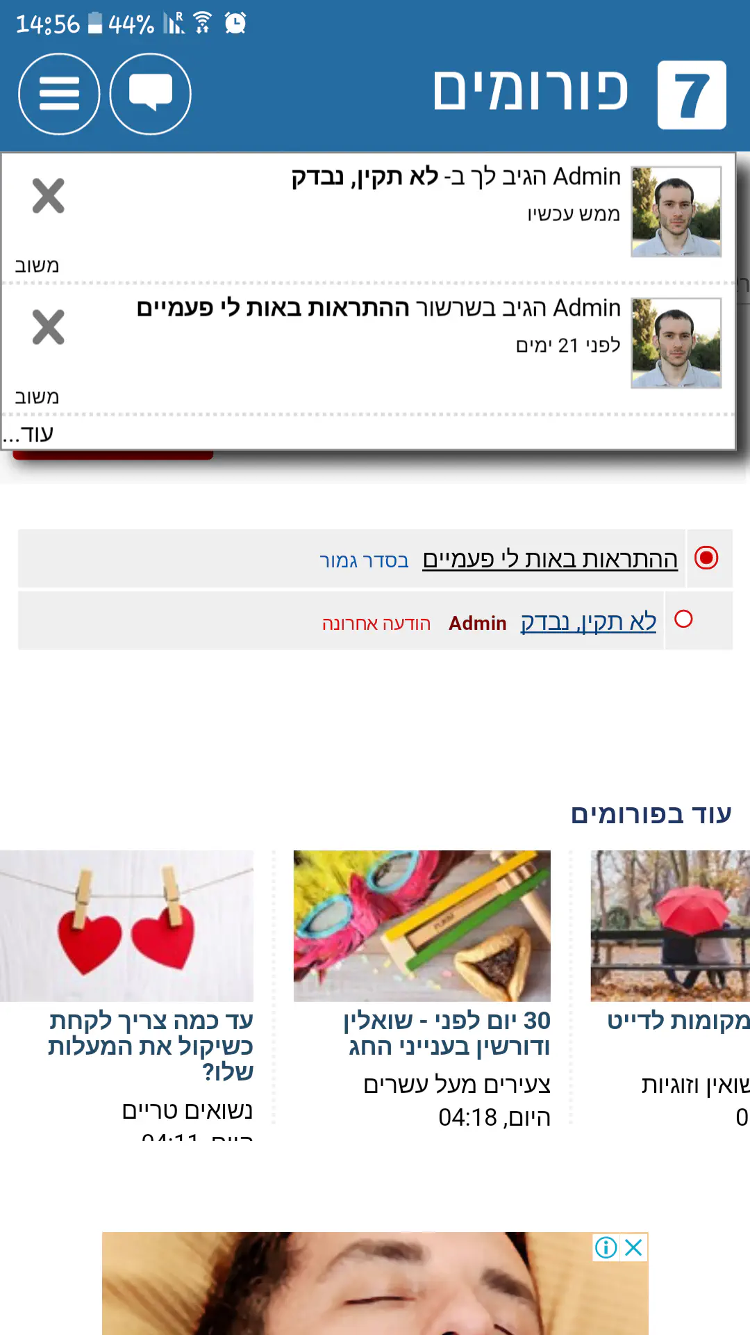 באפליקציה, יש פרסומת מראש העמוד לפעמים, שאפשר להעלים, הבעיה היא שגם כשמעלימים אותה- כל השטח שעליו היא התפרסב לפני כן נשאר ללא אפשרות למגע. כלומר, רואים מה שכתוב אבל לא מגיב למגע. הבעיה הגדולה היא לגבי לחצן התפריט בפינה הימנית העליונה, הוא לא מגיב! @Admin