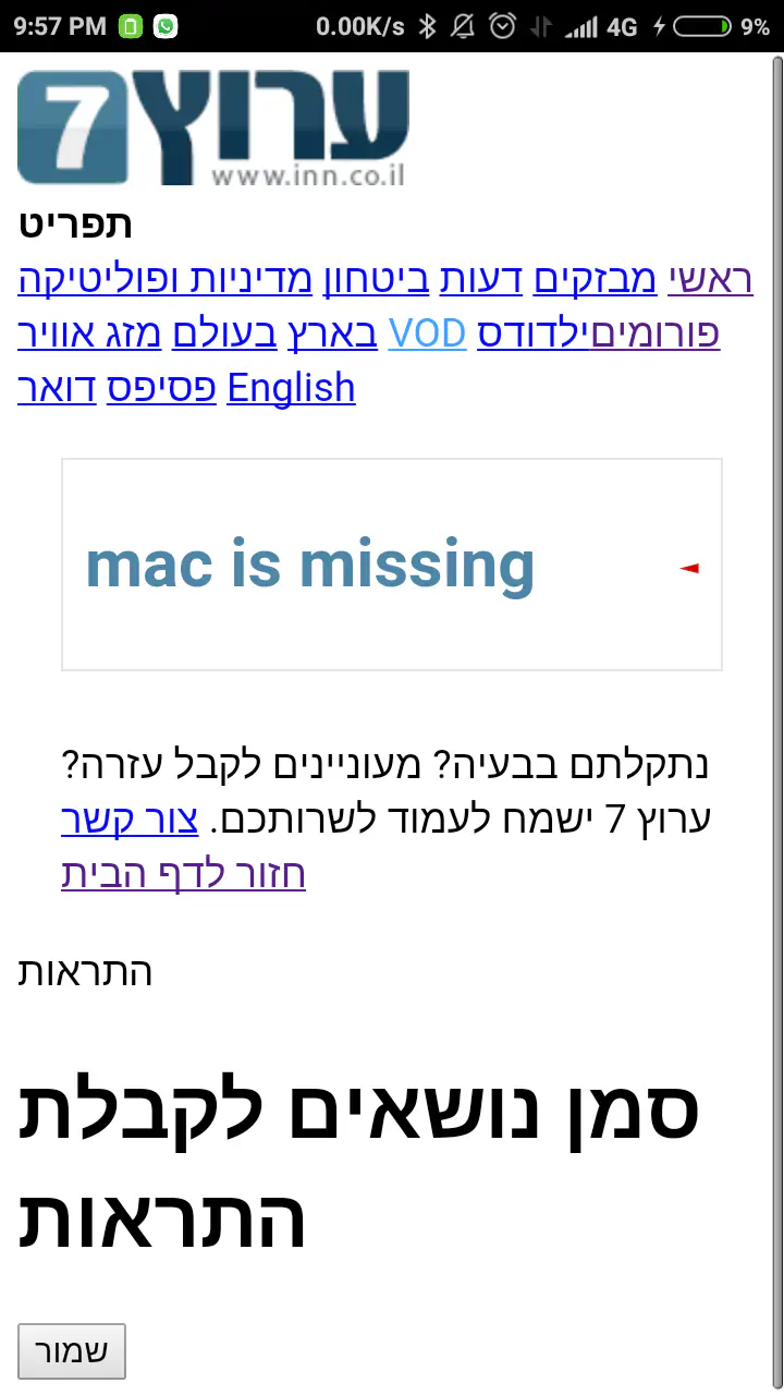 כל פעם שאני נכנסת לערוץ (ורק לערוץ) אני מקבלת דף של: "לא ניתן לגשת לדף זה" (כאילו אין אינטרנט), או "הדף הזה לא עובד, --כתובת האתר-- לא שלח נתונים"