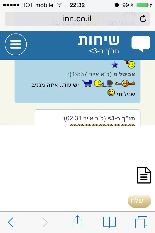 - הצעה: שיהיה כפתור ישיר לדף שיחה אישית שבו רואים שיחות אחרונות כמו בטלפון (מהחלונית שיורדת מלמעלה ב'פורומים')