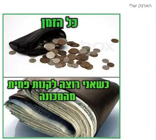 ישראלי אמיתי זה אחד שיקנה חולצה ב-300 שקל וג'ינס ב-600 שקל, אבל אם יתקע שקל אחד במכונה של המסטיקים, כל הקניון על הרגליים.