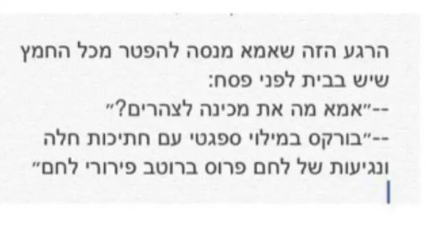 16. רק בשבועיים שלפני פסח, ביסלי, עוגיות, ופלים, שקיות גדולות של שקדי מרק ושש פיתות ביום הופכים להיות מרכיבים חיוניים בהתפתחותו התקינה של הילד .