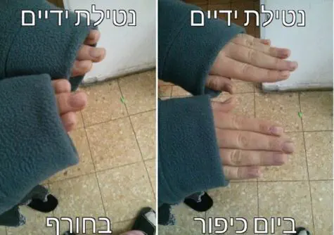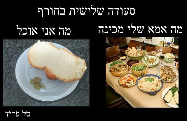 ד. בְּקוּמוֹ מִשׁוּלחָן האוֹכֶל יְקָפֵּץ על רָגְלַיו בִּפְרָאוּת כאילו היה הוא דוֹרך על גחלים לוֹחשות, וינער זרועותיו בפאניקה כמי שכפאוֹ שד, למען יתפטר מן הפירורים שאוּלי נתפסו בבגדיו, שאם לא כן תישמע זעקת "קרישקעס" (פירורים בלע"ז) עוֹלה ויורדת.