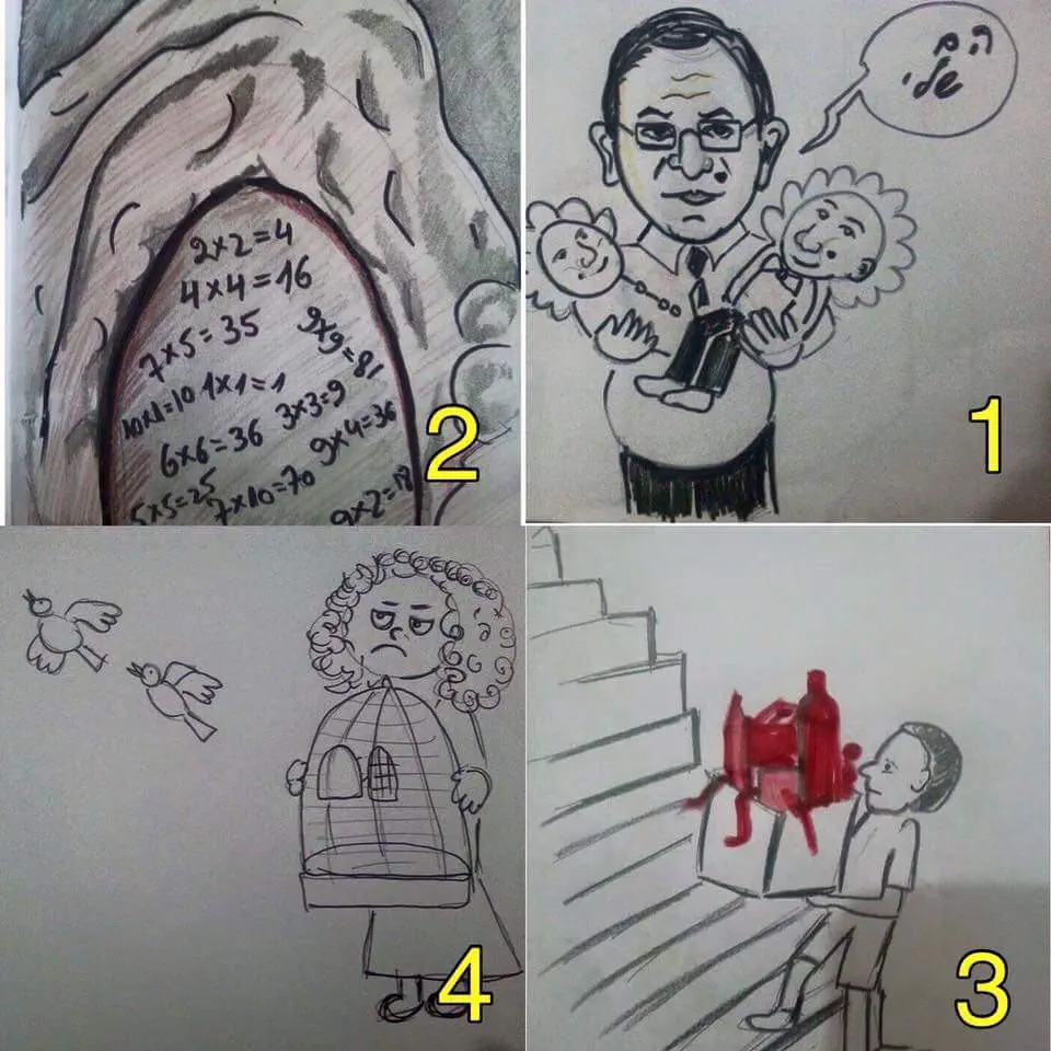 שתי נערות פלסטניות משחקות. אחת אומרת לשניה, 'בואי נשחק אבן נייר ומספריים'מביטה בה הנערה השניה בתמיהה ושואלת 'מה נעשה עם הנייר?!'