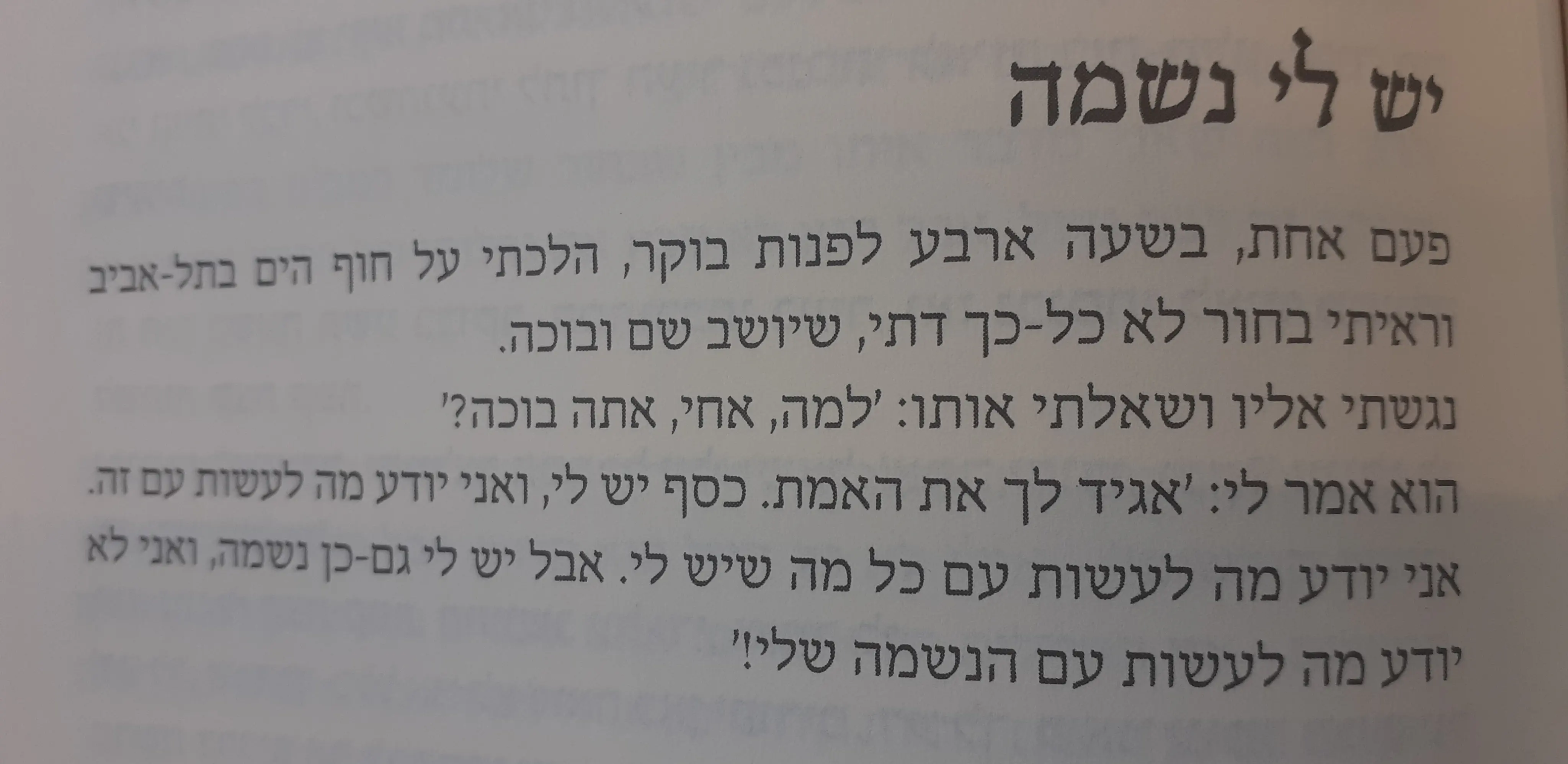 "חח בטח כפרעלייך! ברור שהוא כאן! אם את כאן אז גם הוא כאן.. את זה הוא והוא זה את..כל השאר סתם קליפות שנדחפו בעוונותינו ולא ברצוננו.. את יודעת? אבא שלי כל היום אומר איזה משפט אחד מהגמרא 'קדושה שבהם להיכן הלכה?' שמעי.. הקדושה לא בורחת לשומקום.. היא כל כך נצחית ואינסופית.. לאן יש לה ללכת אה? חח וואי כמה כיף להיות יהודים.." אמונה סימה עם אורות בעיניים, עם נחת שבלב. ומשהו בתחיה ממשיך להתעורר. "אבל אמונה.. איך? איך חיים אתזה? איך מקלפים תקליפות? איך מביאים תמקום הנסתר לעולם הזה?"