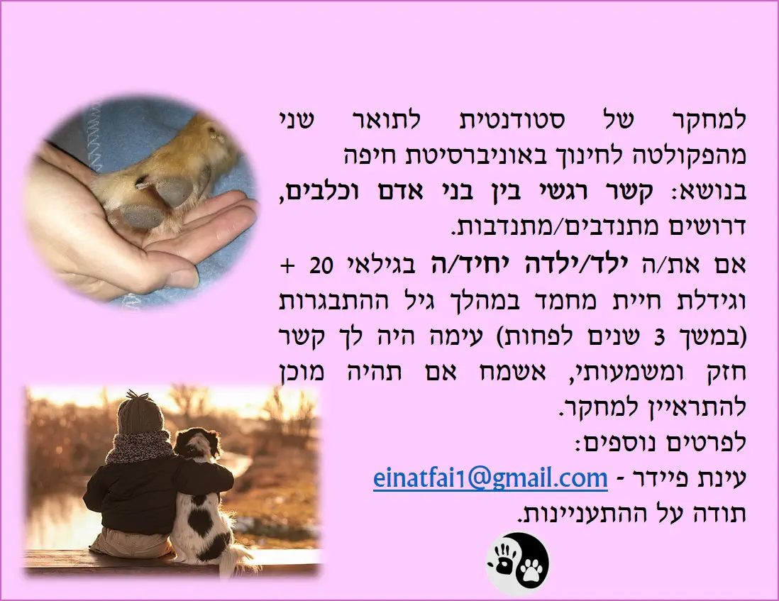 מודעת דרושים למחקר אודות קשר רגשי בין אנשים וכלביםeinatfai