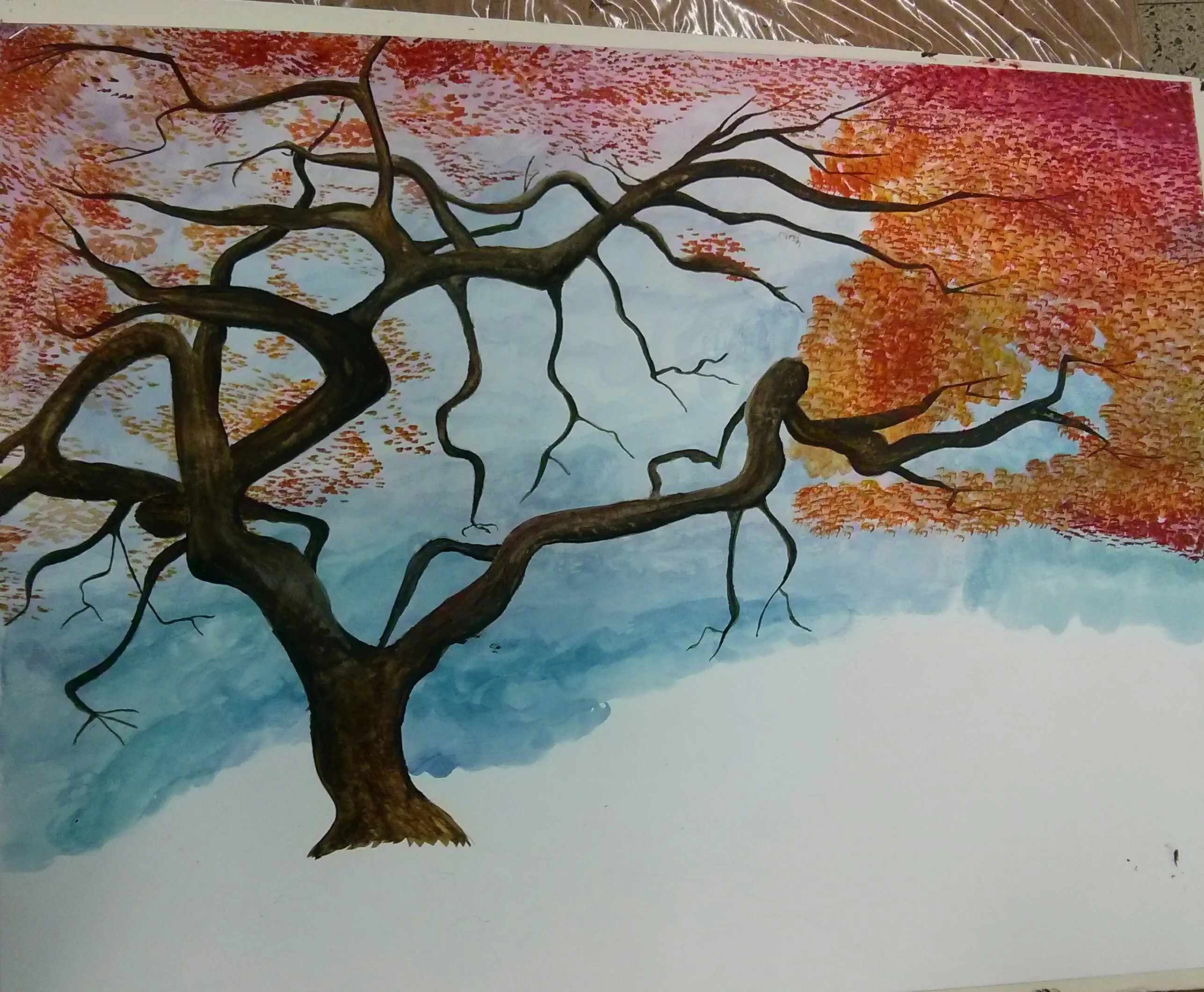 אני משתמשת בצבע משפורפרת, והדלילות היא בהתאם לצורך. למשל, תחילה ציירתי את הרקע, השמים, ושם השתמשתי בהרבה מים יחסית (אני מדללת את הצבע במים). את הגזע ציירתי בשילוב של צבע ומים, אך מעט מים. כנ"ל הרקע לעלים מימין. את העלים עצמם, אני מציירת רק בצבע, ללא מים, ואז זה פחות "צבעי מים", אך כך התבע חזק, וזה מה שאני צריכה.