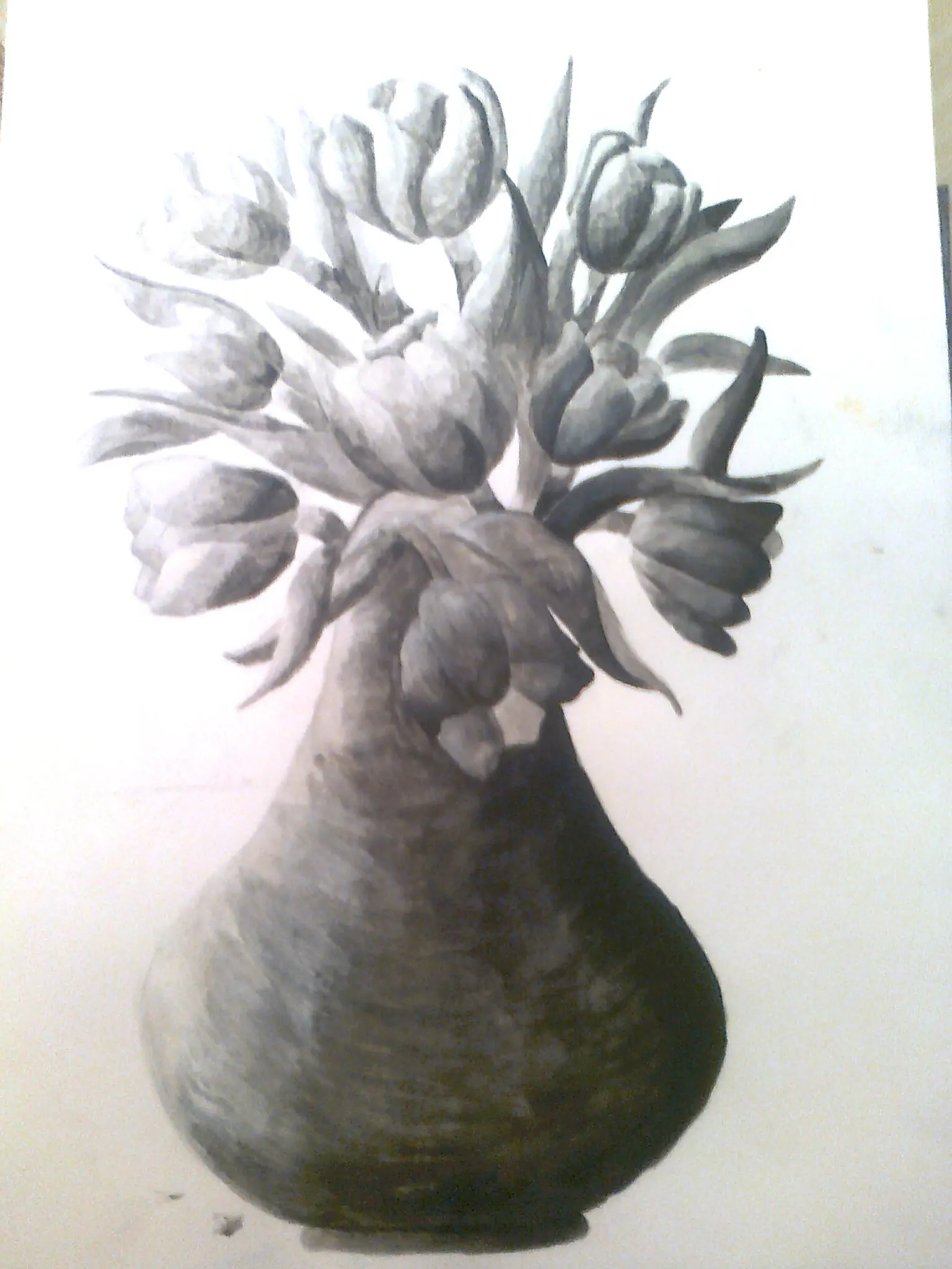 מלי- ההצללות שלך בפנים- בלחיים ובסנטר מוסיפות לזה, הייתי אולי מורידה את הכהות שיצרת מעל עצמות הלחיים הגבוהות- קצת מתחת לשקים של העיניים, איפה שהאף "נפתח", נדמה לי שבלעדיהן הציור יהא יותר אמיתי, הן יוצרות תחושה של צלקת.