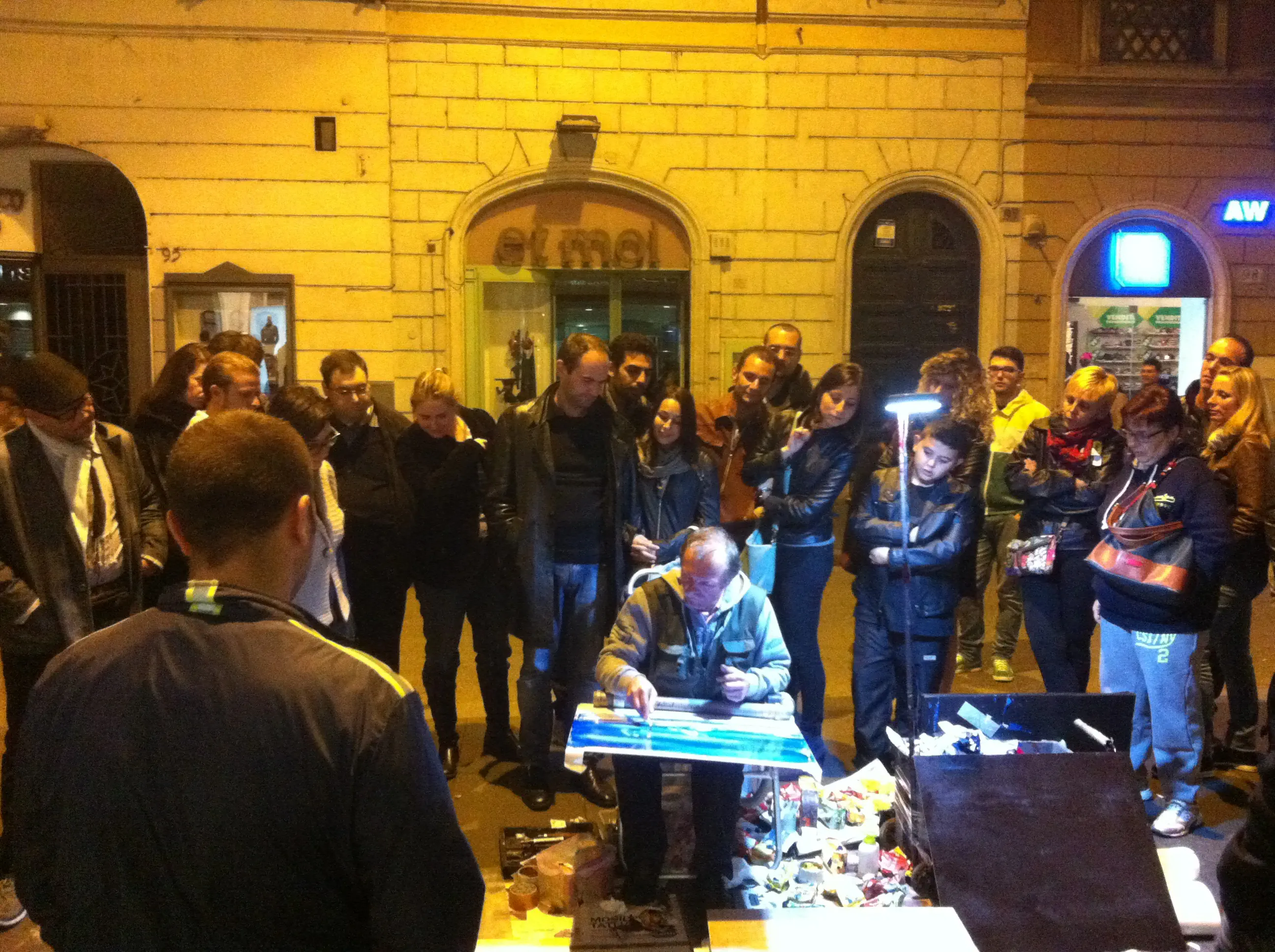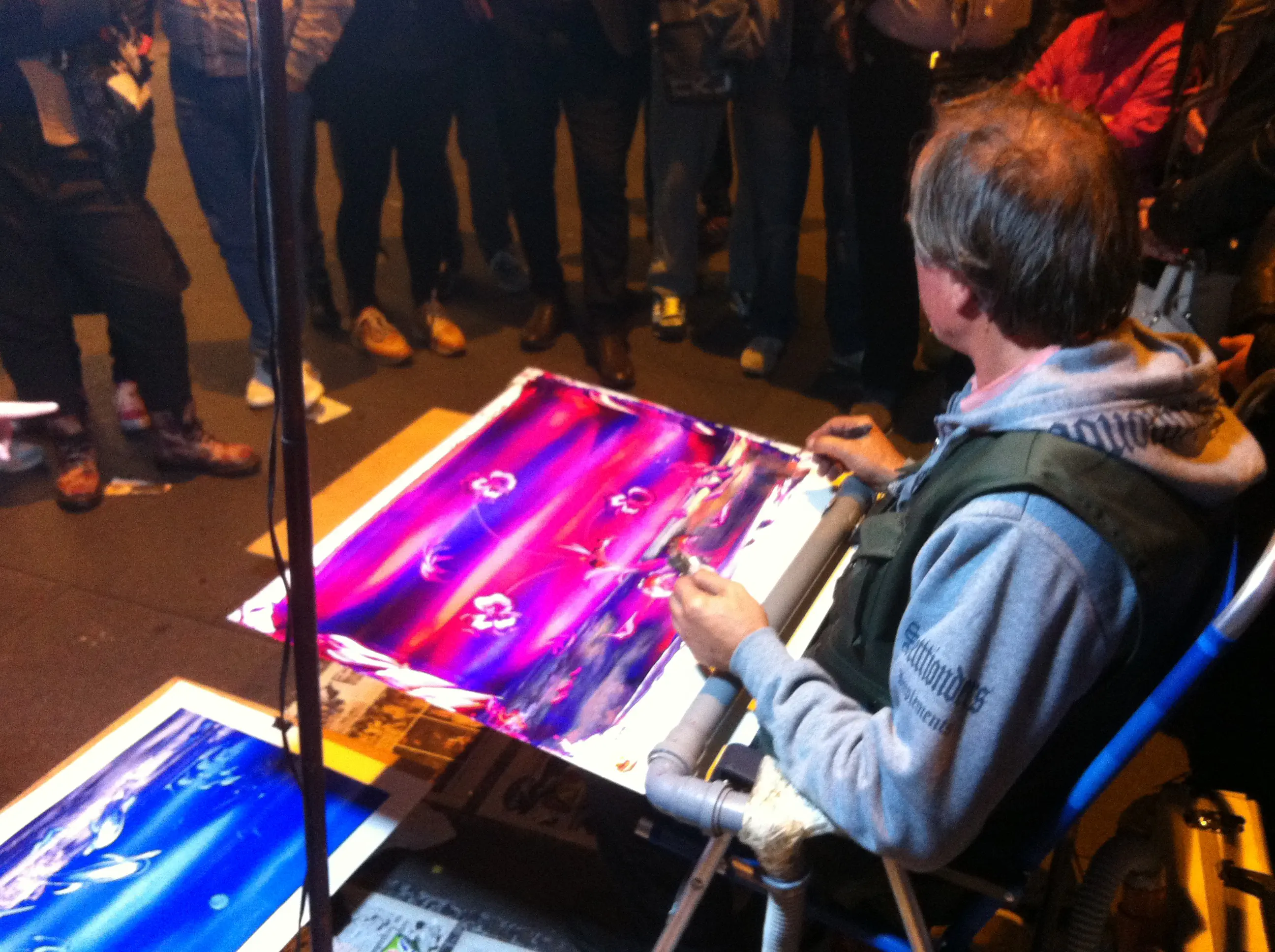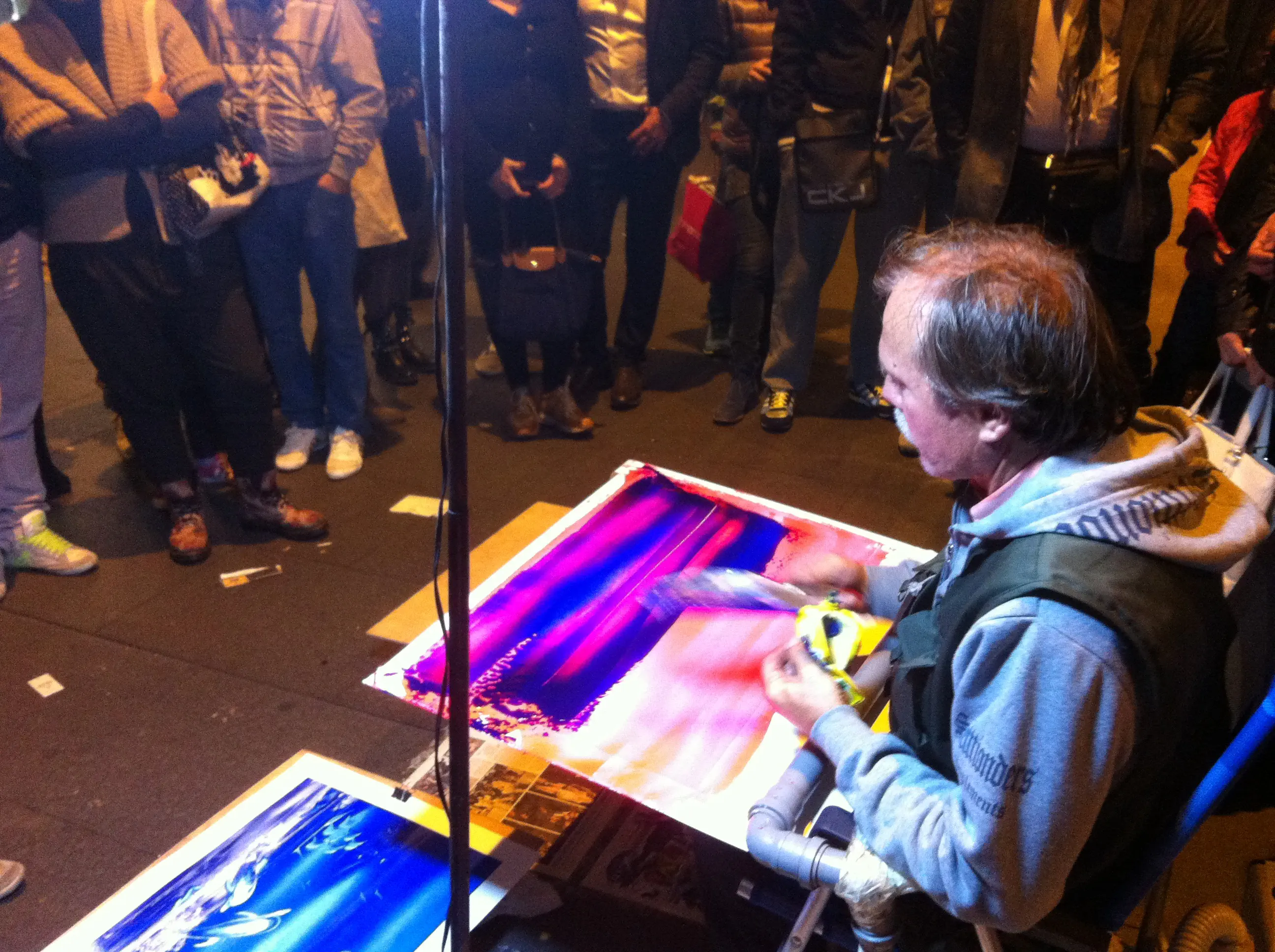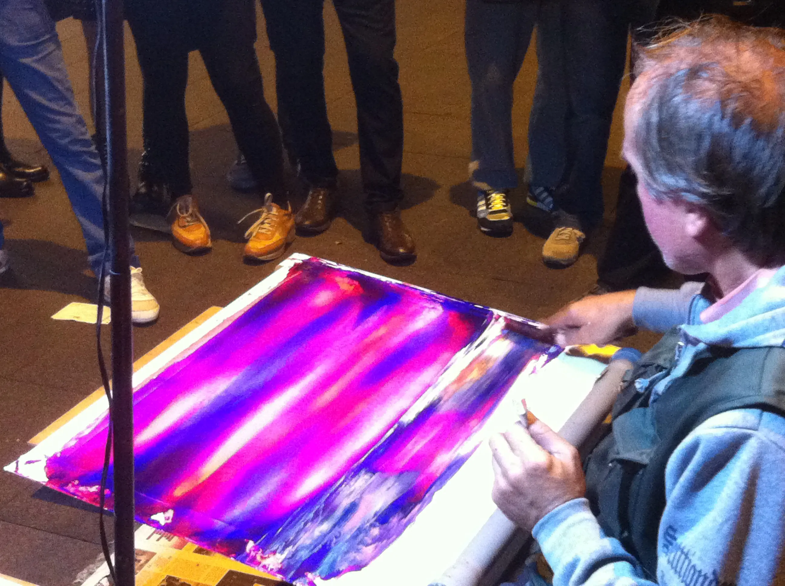 וכו׳ וכו׳ |חולם בהקיץ|)בלבה של התקהלות עצומה היה צייר שמצייר בצבע ושפכטל. ככל שהשכבה דקה יותר היא יותר בהירה. הוא שילב צבעים ומרח אותם למן גוון הרמוני יפהפה. למשל הים בתמונה כאן- שימו לב לצבעים בצד ימין.