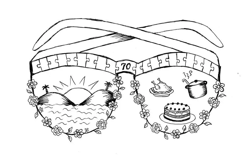 ליומולדת 70 של סבתא שלה... הרעיון - איך העולם נראה דרך ה"משקפיים של סבתא". בציור נראים כל הדברים שהיא אוהבת לעשות - מאוד אוהבת פרחים, פאזלים, לבשל, לטוס מעבר לים (ובכלל חולת ים, כך הבנתי) ולטייל.