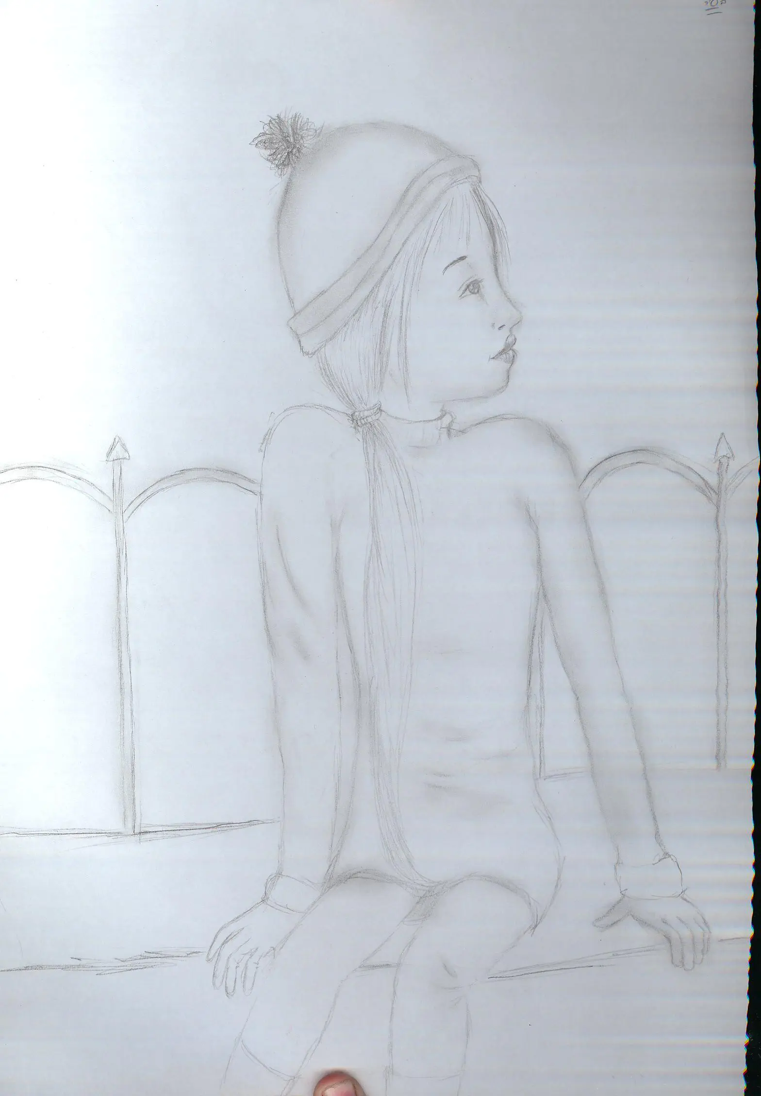 ) שלך צוירו בגוונים בהירים, שלה בגוונים כהים. את ציירת קווצת-קווצת שיער. היא- הוא נראה יותר כמו שבכה כהה. גם הגבות שלה מודגשות ועבות יותר. - הדמות שלך נראית ילדותית יחסית- בגלל המצח הגבוה והרחב יחסית, מיקום העיניים ו"כל העסק" נמוך, הלחיים הרחבות והעגלגלות והעיניים הרכות.
