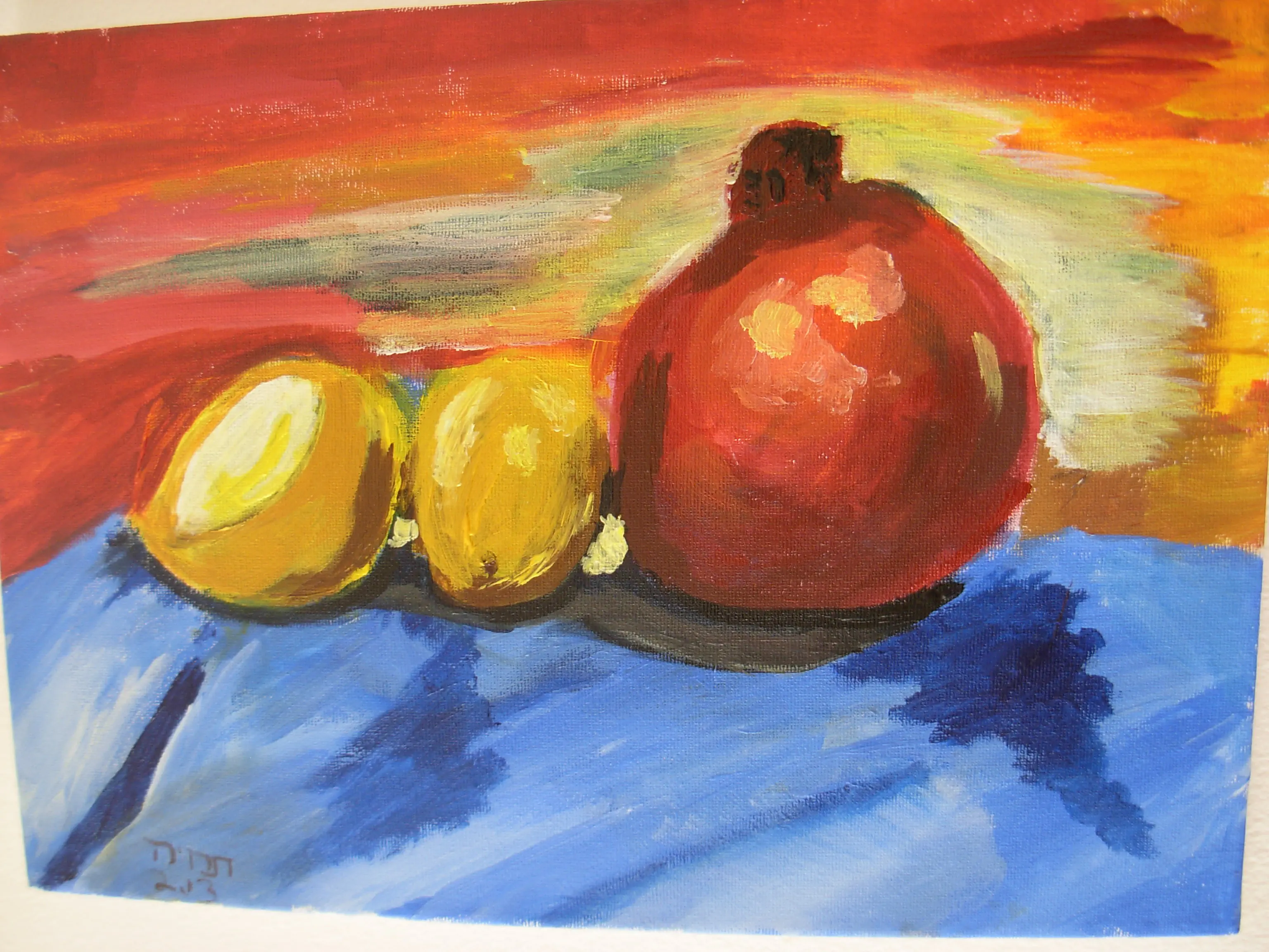 אהבתי את הרימון- השתמשת בגוונים רבים ונתת לו את הצורה העגולה-אך-לא-מושלמת, כמו של רימון!