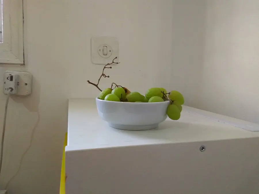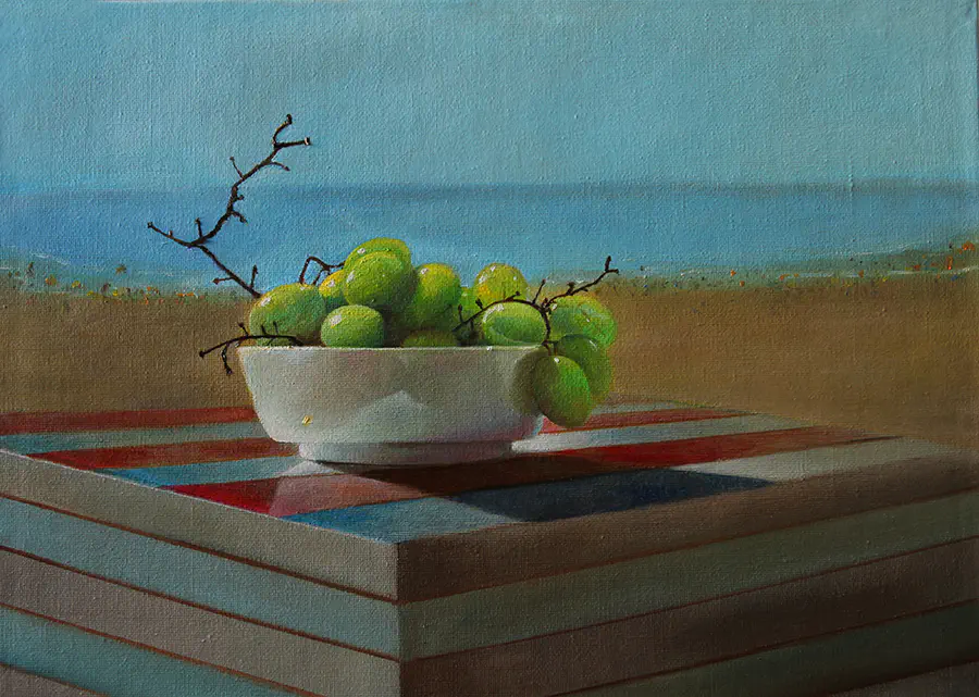 אבל משהו בציור כתמונה לא מסתדר לי. הרקע מרמז שמדובר בחוף ים אבל התאורה חשוכה מאוד והצל החזק שהקערה מטילה נראה לא הגיוני. מרגיש כאילו מדובר בציור קיר של חוף ים באיזו מסעדה שמגישים בה ענבים ולא כמו הדבר האמיתי. זה יוצר הרגשה סינתטית ולא כך כך כיפית (אפילו קצת עצובה). בעיקר זה לא גורם לי לרצות ענבים...אלא ים. עוד משהו קטן ופחות משמעותי- הקערה מונחת בצורה מעט מוזרה על השולחן מבחינת פרספקטיבה. חוץ מזה בסה"כ זה נראה מעולה כרגיל. כל הכבוד