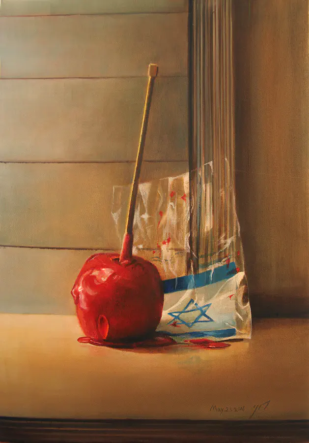 הדגל של ישראל די קמוט ומלוכלך, ואת נוכחות התמונה תופס התפוח (?) הטבול בצבע, או בדם...