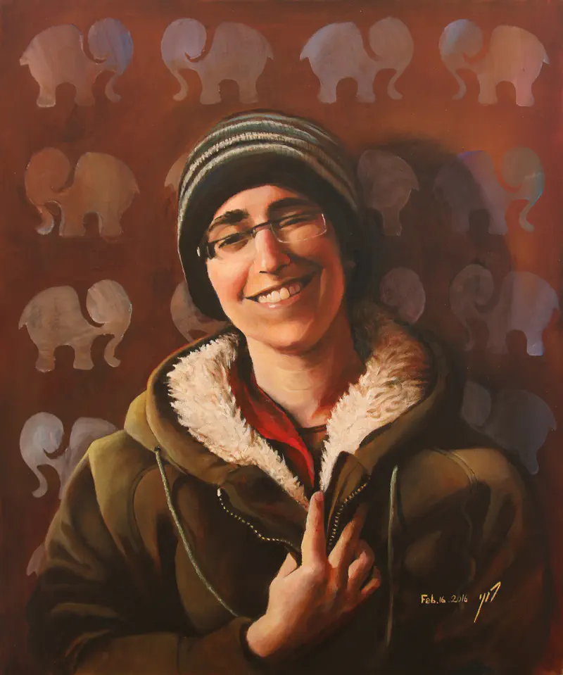 ובכל זאת: אהבתי את הרקע של הפילים. הוא היה במקור? הוא שזה שילוב מעניין שלך? (ואיך את בכלל מציירת דיוקנאות עצמיים?