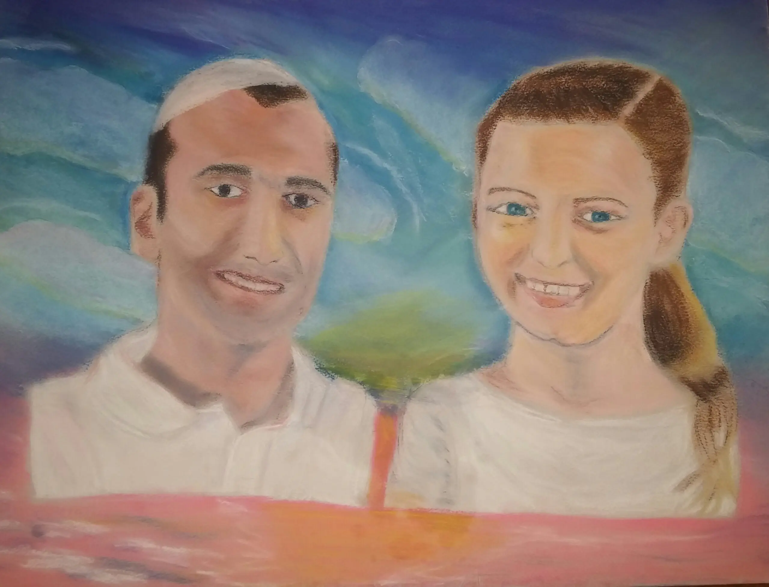 השיער של שניהם מאד יפה ואמין. הפנים החולצה שלו. מאד מאד מוצלח. הרקע מושקע. אבל הדמויות לא באות עליו בטבעיות.בחלק התחתון האדום. הן לא מתמזגות. לא יודעת אם אפשר לתקן בסוג הצבעים הזה. אבל הפרופורציה בין הראש שלה לגוף נראית צריכה תיקון.