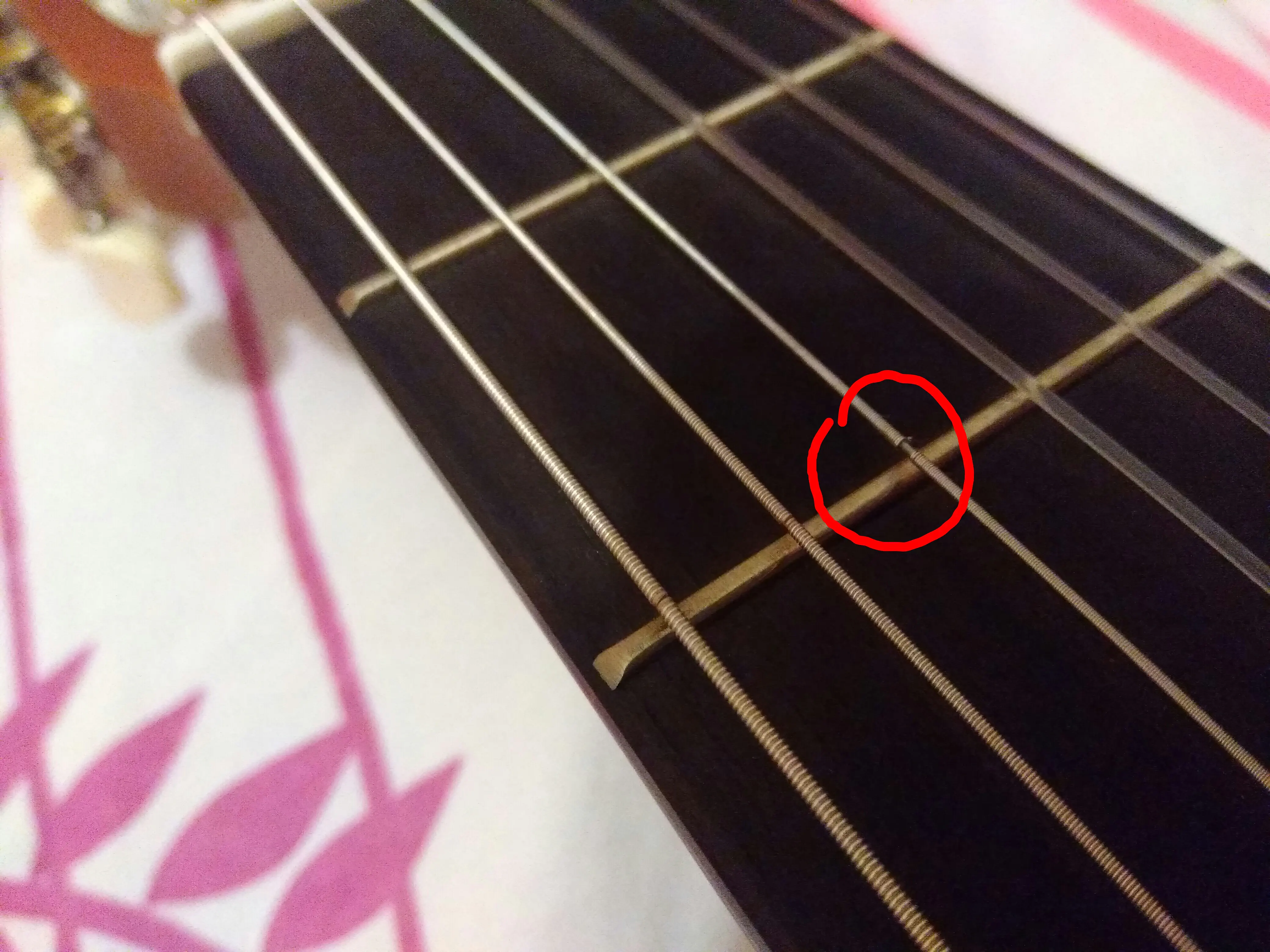פלח הרימוןראיתי שהסליל שעוטף את המיתר הרביעי נפרם/ נפתח או מה שזה, באיזור החלק המתכתי שעל הסריג.