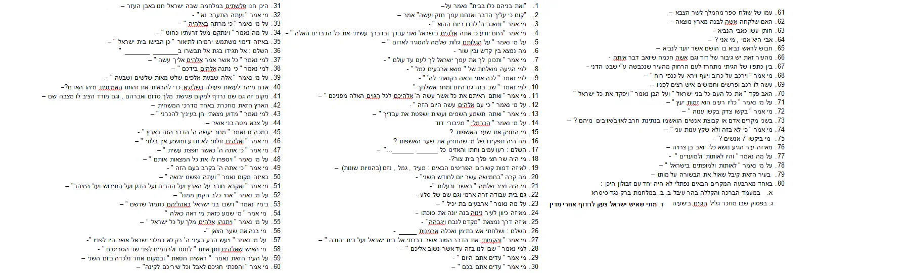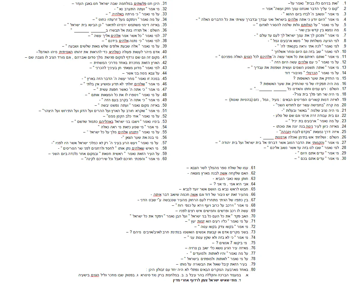 ואני נורא אשמח אם תכתבו לי שאלות על במדבר פרקים ט'- י"ז, י"ט- כ"ט, ל"ב, ל"ו, כל ספר שמואל, כל מלכים א' ומלכים ב' פרקים א'- ב'. תודה!