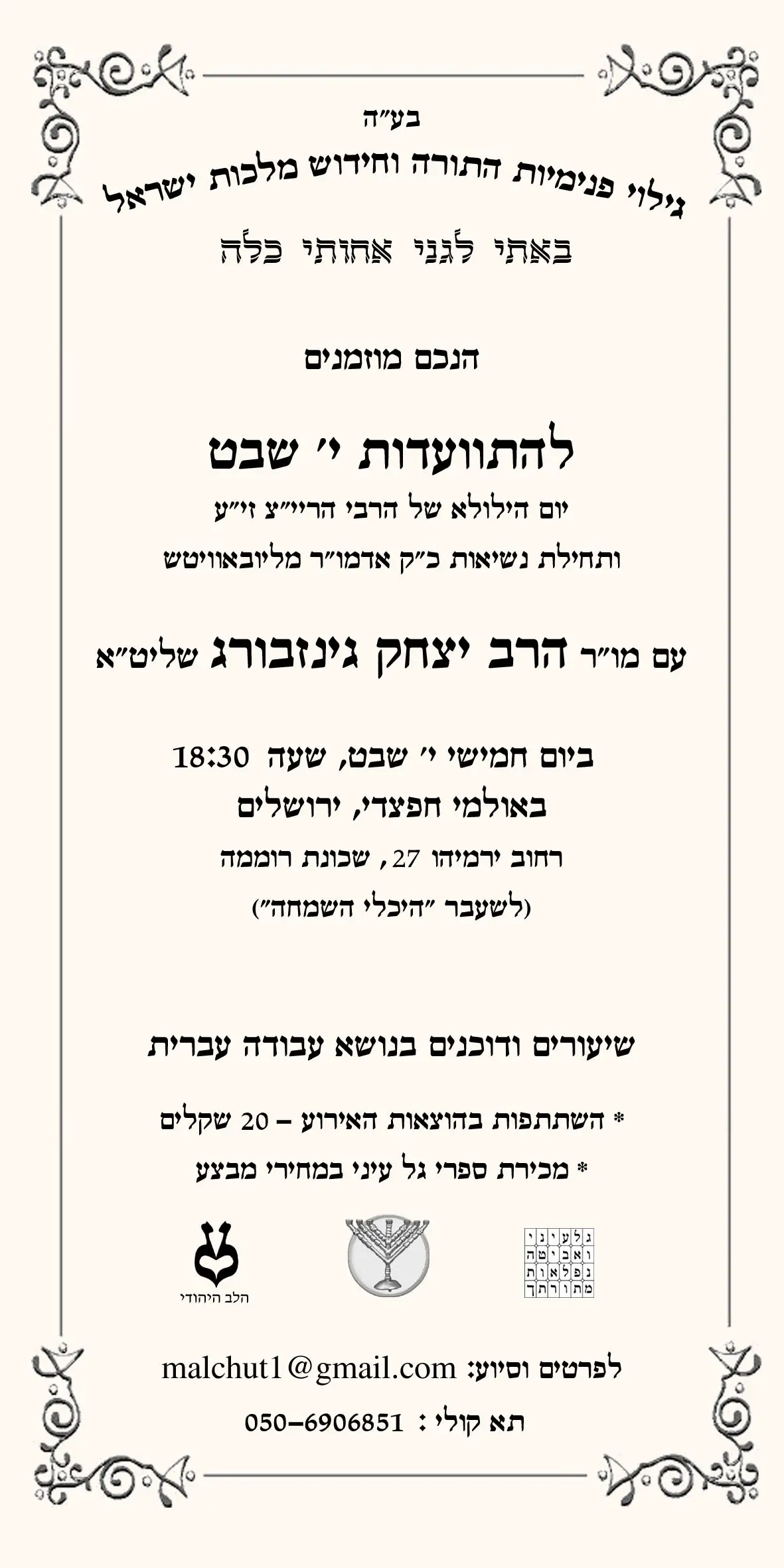 שבוע קודם לכן, באולם שמחות גדול בשכונת רוממה בירושלים, חגגו מאות צעירים וצעירות, משני צדיה של מחיצה אטומה, את "חג הגאולה" - היום שבו שוחרר האדמו"ר הזקן של חב"ד ממאסר שנגזר עליו בשלהי המאה ה-18, בשל הלשנה של "המתנגדים" כחלק ממאבקם בחסידים. גם שם שרו ורקדו ולגמו וודקה בין פרק לפרק בשיעור הארוך שמסר רבם. הרב ישב לבד על הבמה, לפניו שולחן, מאחוריו שלט: "התוועדות י"ט כסלו, עם מורנו ורבנו הרב יצחק גינזבורג מלך המשיח שליט"א".
