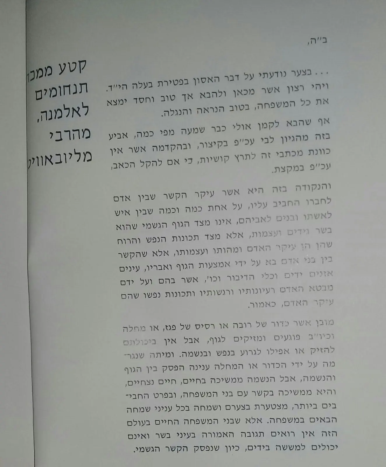 "רבי מנחם מענדל שניאורסאהן בימינו ממשיך בעוז ונושא ברמה את שלשלת נשיאי חב"ד, אבירי הרועים מדור לדור. אף בו נתאחדו במזג טוב ובמתכונת נאותה עומק העיון וחן ההסברה. עושר המדרש וכשרון המעשה, לומדות חריפה בנגלה ובנסתר וחכמת ההנהגה. בינה יתירה ניתנה לו לישב בצל רבותיו מאורות החב"ד, להסתמך הרבה עליהם עד כדי להבליע את חידושי-תורתו בתוך שלהם, לגלות בשיחותיהם המפורשות וברמזי-דיבוריהם כל רעיון נכון ומחיה-נפש הנובע ממקורו שלו. זכתה משנת חב"ד, שאין שכינת חכמה בינה ודעת זזה מבית מדרשה ובמלכותה אין חס ושלום שקיעה וסתימת המעיינות. עד שלא שקעה שמשו של מורה זה בחב"ד זורחת שמשו של זה. מעיין אל מעיין קורא: קום ורש אותי! רבי מנחם שניאורסאהן הוא כעת היורש המפואר. יורש מפואר הוא זה, שאינו רק יורש, אלא גם מוריש כביכול לקודמיו, כי הוא מחיה את דברי קודמיו וזורק עליהם אור חדש. אור הזמן החדש, אור החכמה בת הזמן החדש, אור הנשמה החדשה של היורש. וכלום מהי נשמה חדשה?