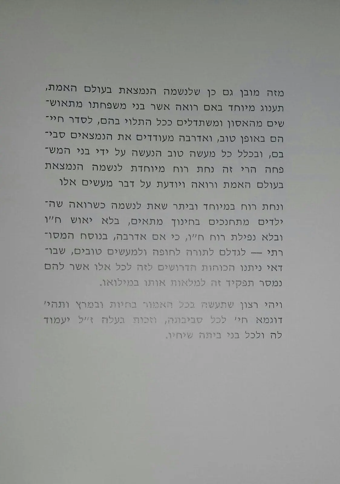 "אולם ברכה שיש עמה הערכה מן הדין הוא שתיעשה על המוגמר. היינו, על תנובת הרוח. שכבר נערמה ונאספה הגרנה. על חידושי-תורה שנתקבצו למעין משנה סדורה או שיטה ערוכה, שיש בהם תמצית וסך הכל. ברכה הקודמת לסך הכל, כמדומה, אינה מידה. אפשר להביע התפעלות מן העץ בלבלובו ומן המעין בשעת נביעתו, אבל חכם העומד בעצם לבלובו ובמלוא נביעתו והוא כמעין המתגבר – הלא נאה לנו להקשיב לו בדומיה. כל הבעת רגש של התפעלות היא בגדר הפרעה; כל קריאת-אישור היא מעין קריאת-ביניים, שיש בה משום מיעוט דרך ארץ. האדמו"ר האמצעי, שהיה כמעין המתגבר וכנהר שאינו פוסק להעמקת רעיונותיו, והיה שופך שיחו ממעמקים, מתוך שני מעמקים, עומק-רום ועומק-תחת, נוהג היה ללוות כל דיבור שלו בקריאה הס-הס! זו היתה בקשה על הדממה, תחנון על השתיקה. תפוחי זהב במשכיות כסף הם דיבור בשכיות השתיקה האופפות אותו. שיחה הצומחת מתוך באר השתיקה היא לבדה בחזקת דיבור חי, הנושא את עצמו ואת כלל שומעיו. אין הברכה שורה אלא על הסמוי מן העין – ואף מן הפה.