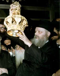 בתמונה: הרבי שם את הכתר של ספר תורה של משיח.