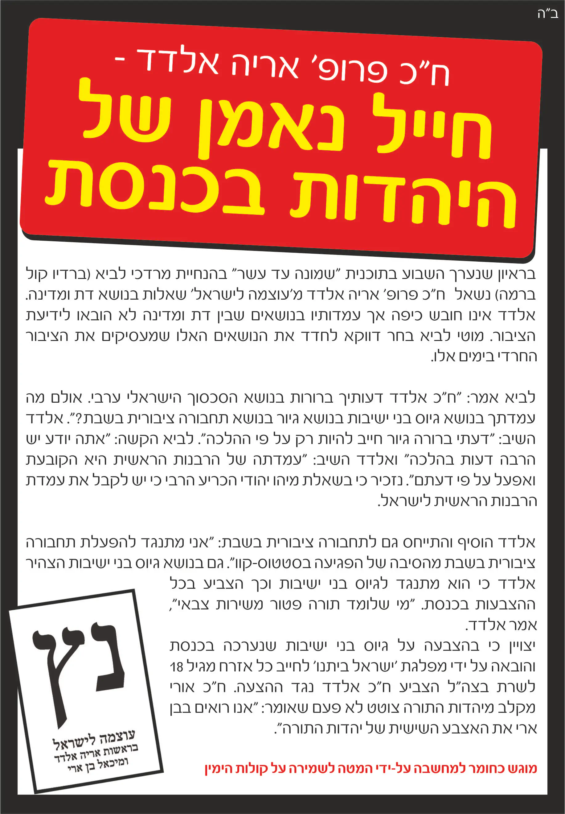 כיצד הוא מתכוון לפעול במישור הציבורי בכל העניינים החשובים הללו (גיור כהלכה, תורתו אומנותו, צביון יהודי וכו') ועל כך הוא סיפק השבוע תשובות די ברורות. המפלגות ה"חרדיות" לעומתו, הן שהכשילו פעם אחר פעם את תיקון חוק מיהו יהודי שעל כך הרבי זעק מקירות ליבו במשך עשרות שנים!...