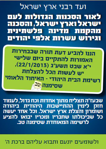 וכמובן כולנו מתגייסים להכנסת הרב הלל הורוביץ לכנסת ומצביעים לרשימת הימין המאוחדת הבית היהודי שסימנה טב.