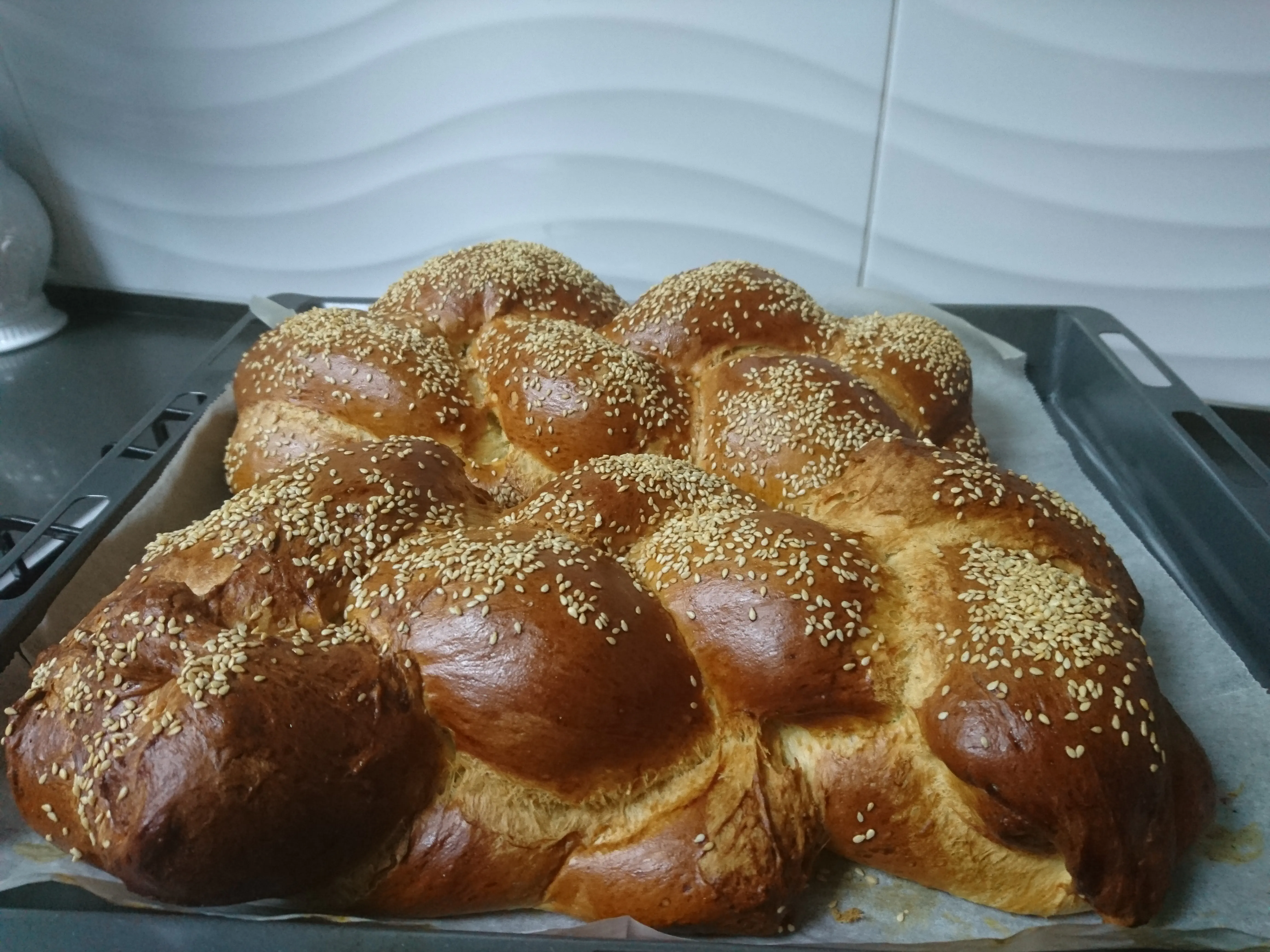 ומגלגל לא מאוד אדוק אבל גם לא רופף לגליל ומניח בצד ככה עושה את כל הכדורים ומתחיל לקלוע שם להתפחה על מזגן על חום כבד מורח ביצה טרופה עם טיפה מלח מכניס לתנור שחומם מראש על 180 לתנור עם אדים בערך 45 דק