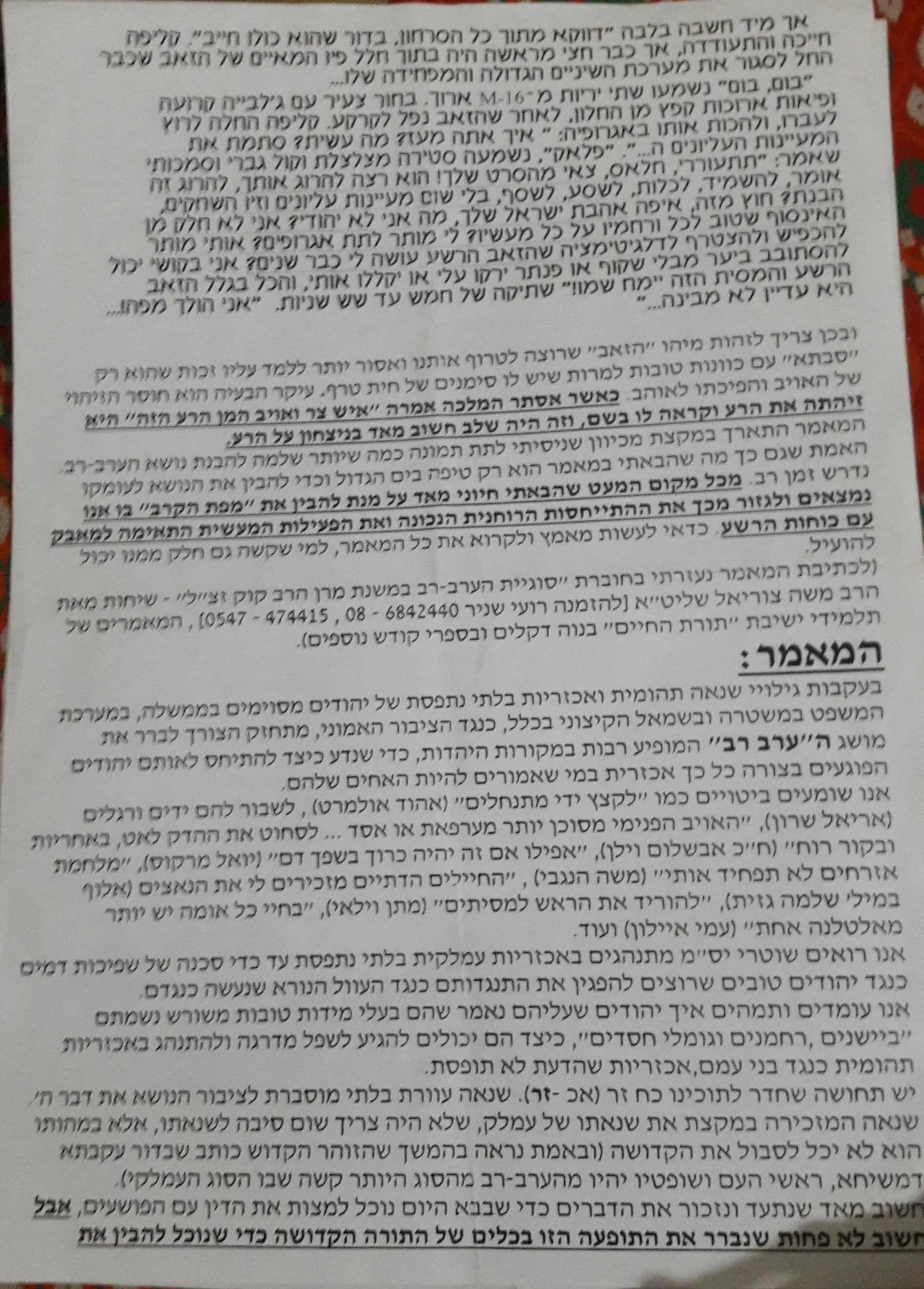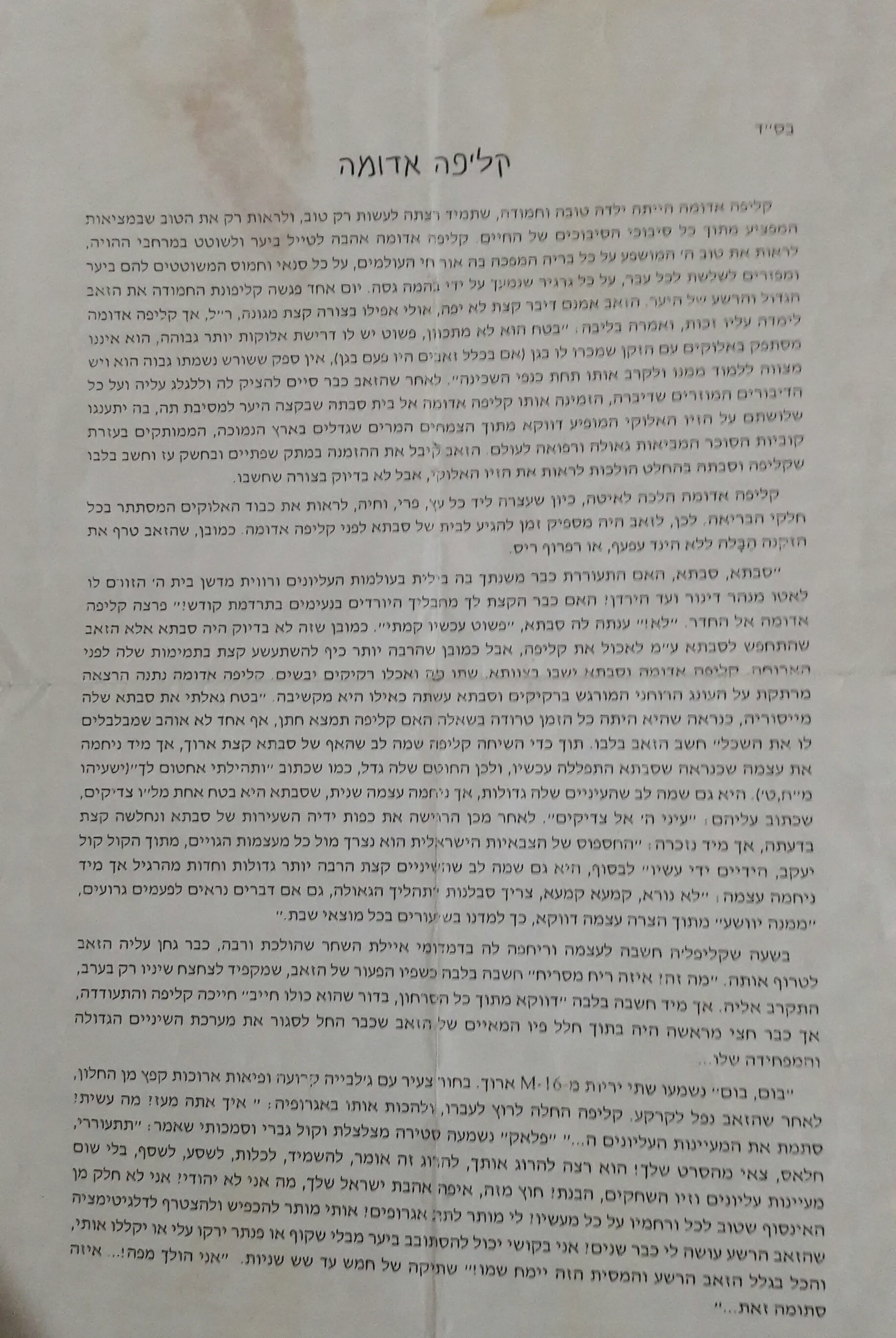 וקרה שיצאנו לסיור בצהריי יום שישי והשמש התחילה לשקוע והכל נראה אותו דבר בדיוק, אותו סיור כמו שעשינו אתמול ושלשום ונעשה מחר ומחרתיים אבל איכשהו השמש הייתה קצת אחרת, שמש שוקעת של יום שישי, והאוויר גם היה קצת אחרת לא יודע להסביר בדיוק מה, ואני יושב באחורי ג'יפ סופה עם אפוד ונשק ועוד כמה חיילים וכולם שבוזים אבל אני נושם נשימות עמוקות ומחייך ושר לעצמי לכה דודי כי עד שנחזור מהסיור זה כבר יהיה עמוק עמוק בתוך שבת.