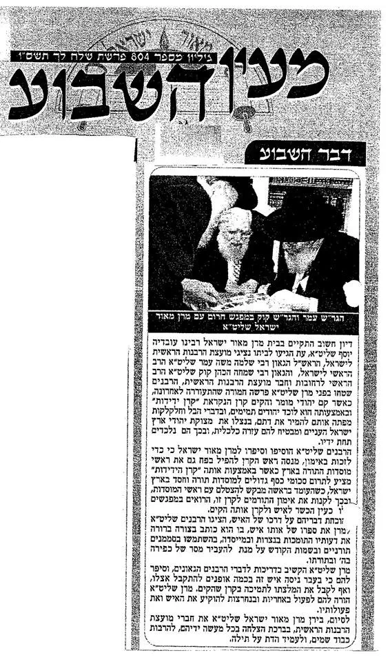 חכמי התורה הגר"ע יוסף זצוק״ל, בעניין הקרן לידידות- יחיאל אקשטיין, ביקור האפיפיור בישראל, ומסירת חלקים ממתחם קבר דוד המלך לידי נוצרים. בעת ביקור האפיפיור לפני כחמש שנים, הורה מרן לשרי ש״ס לא להשתתף בטקסים לכבודו משתי סיבות : א. היות והאפיפיור היה עם עבר בהיטלר יוגנד - תנועת הנוער הנאצית והדבר עלול לפגוע ברגשותיהם של ניצולי השואה. ב. דרישות הותיקן לקבל לידיהם חלקים מקבר דוד המלך ועוד מקומות בארץ ישראל. על דעתו של סבא בעניין מסירת חדר במתחם קבר דוד לידי הותיקן אפשר ללמוד מסיפור שקרה לפני 15 שנה. השר לשעבר ויו״ר המפד״ל אבנר חי שאקי ז״ל, מכר בתום לב ליחיאל אקשטיין מהקרן לידידות דירה קטנה הממוקמת בכניסה האחורית למתחם קבר דוד המלך בהר ציון. לא רבים ידעו אז שיחיאל אקשטיין קשור לנוצרים אוונגלים ומכנה עצמו ״יהודי למען ישו״. הגברת מינה פנטון תחי׳, חברת מועצת העיר ירושלים דאז מטעם סיעת המפד"ל ולוחמת ידועה ונחרצת נגד כתות ומסיון, פונה אל שאקי ומעמידה אותו על טעותו הקריטית. אבנר חי שאקי מתייעץ עם סבא שמורה לו בנחרצות לבטל מיידית את חוזה המכירה ולשאת בנזק ביטולו. אבנר חי שאקי קיים את הפסיקה של סבא באומץ לב, ביטל את החוזה, שילם קנס כבד בסך 275,000 $ והשיב את הבית לידיו. בשנת תשס״ו מגיעים לבית סבא חברי מוצת הרבנות הראשית הגאונים הרב שמחה הכהן קוק שליט"א והראשון לציון הרב שלמה משה עמר שליט״א ומציגים בפניו את השאלה :האם מותר ליטול כספים מיחיאל אקשטיין והקרן לידידות לאור הנתונים שבידיהם. סבא הורה בכל תוקף לאסור נטילת כספים מהקרן לידידות. (יוני יוסף)
