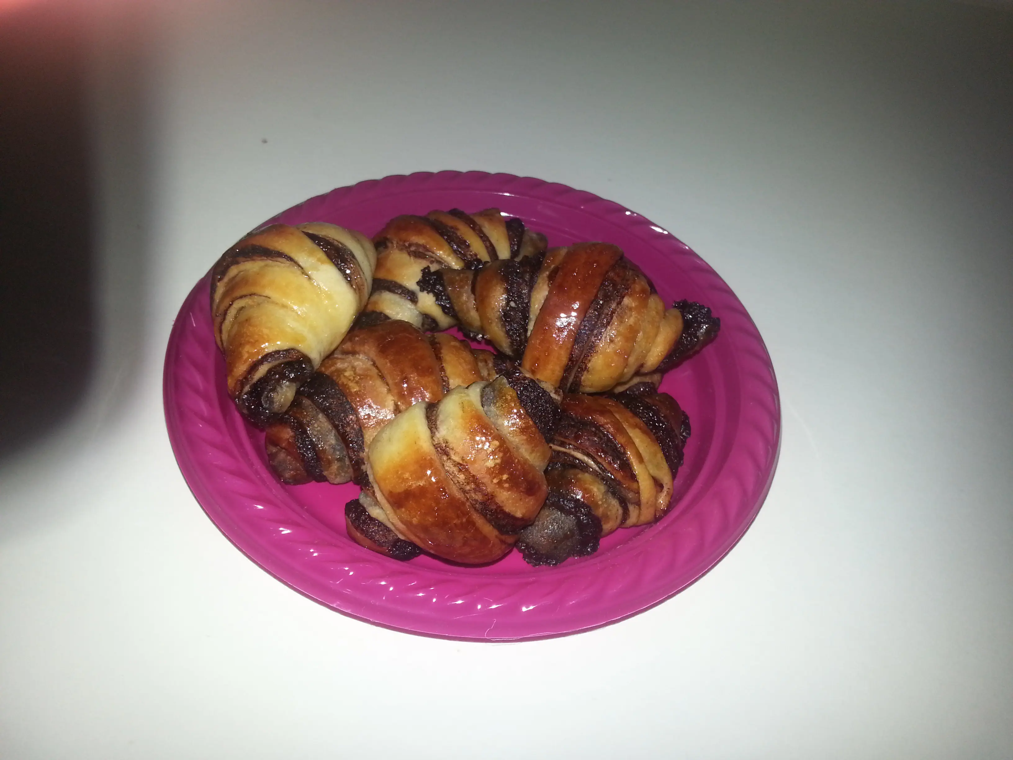 אחר כך כל רבע חותכים ל5 או 6 משולשים ארוכים וצרים. מתחילים לגלגל לרוגלך מהקצה החיצוני כלפי פנים, מניחים את הרוגלך על תבנית עם נייר אפיה כאשר השפיץ למטה שלא יברח באפיה.