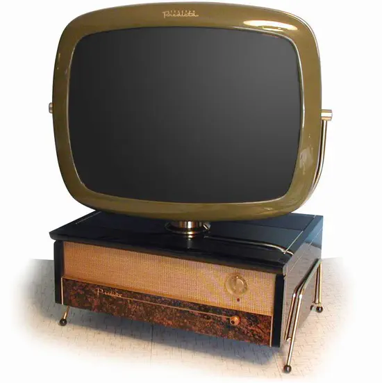 מכשירי הטלוויזיה הראשונים היו מכונות גדולות בעלות מסך קטן. במכשיר שבתמונה המסך נמצא בשקע בצד ימין של המקלט.