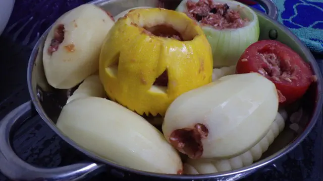 הכל ממולא בבשר ורסק עגבניות ואח"כ כוסה במים והתבשל שעתיים על אש קטנה.