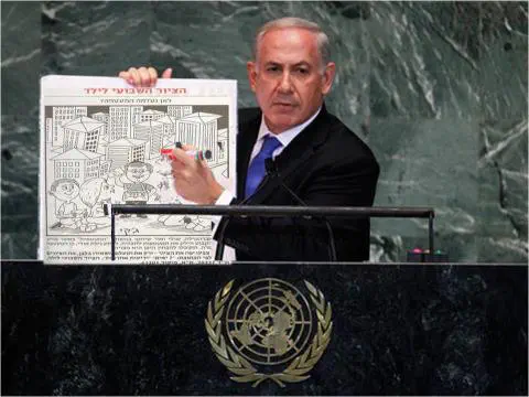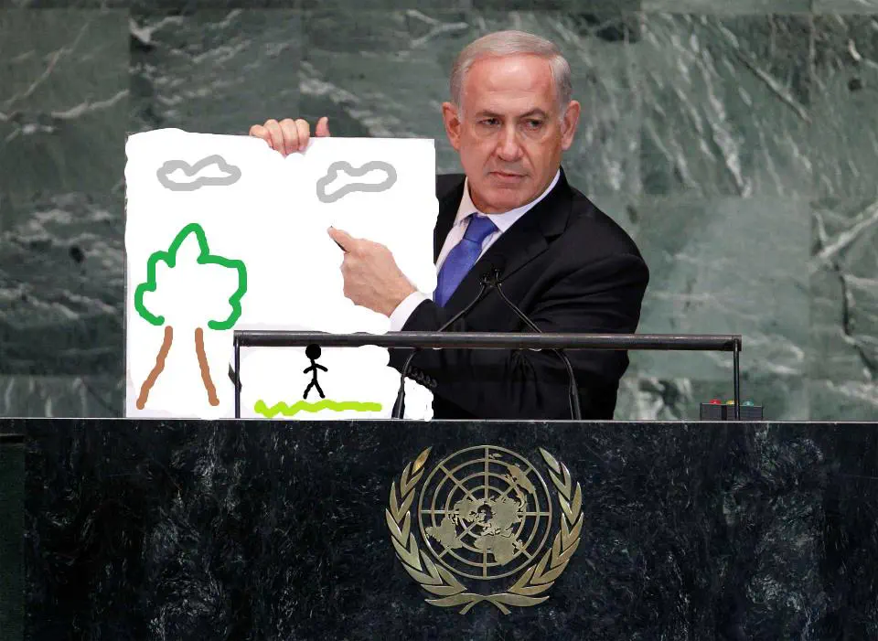 הראו את ביבי בעצרת האום.. הביא תמונה של פצצה עם אחוזים כמה איראן רחוקה מפצצה..