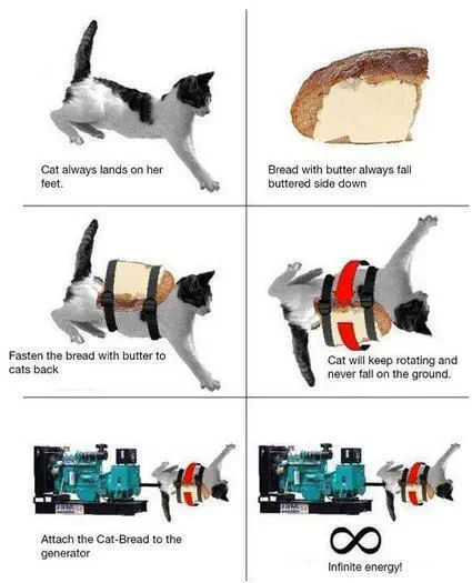 של גנרטור מחובר לחתול ועל הגב שלו פרוסה של לחם עם ממרח. נחש מה קורה...
