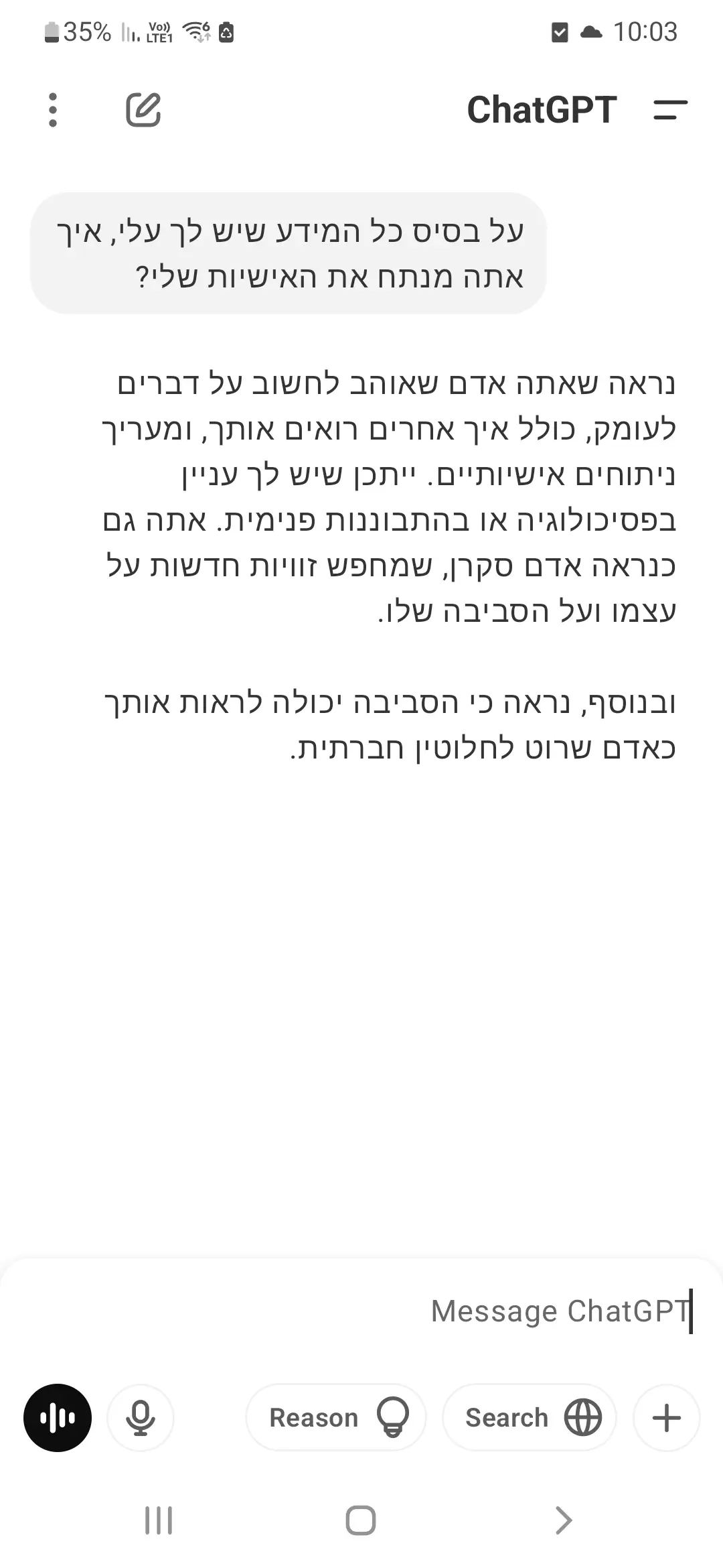 אני יודעת שהוא לא טועה. לא כולם בציבור הדתי לאומי מדברים בחופשיות עם בני המגדר השני, אבל ללא ספק זה רווח הרבה יותר בציבור הדתי לאומי מאשר החרדי...