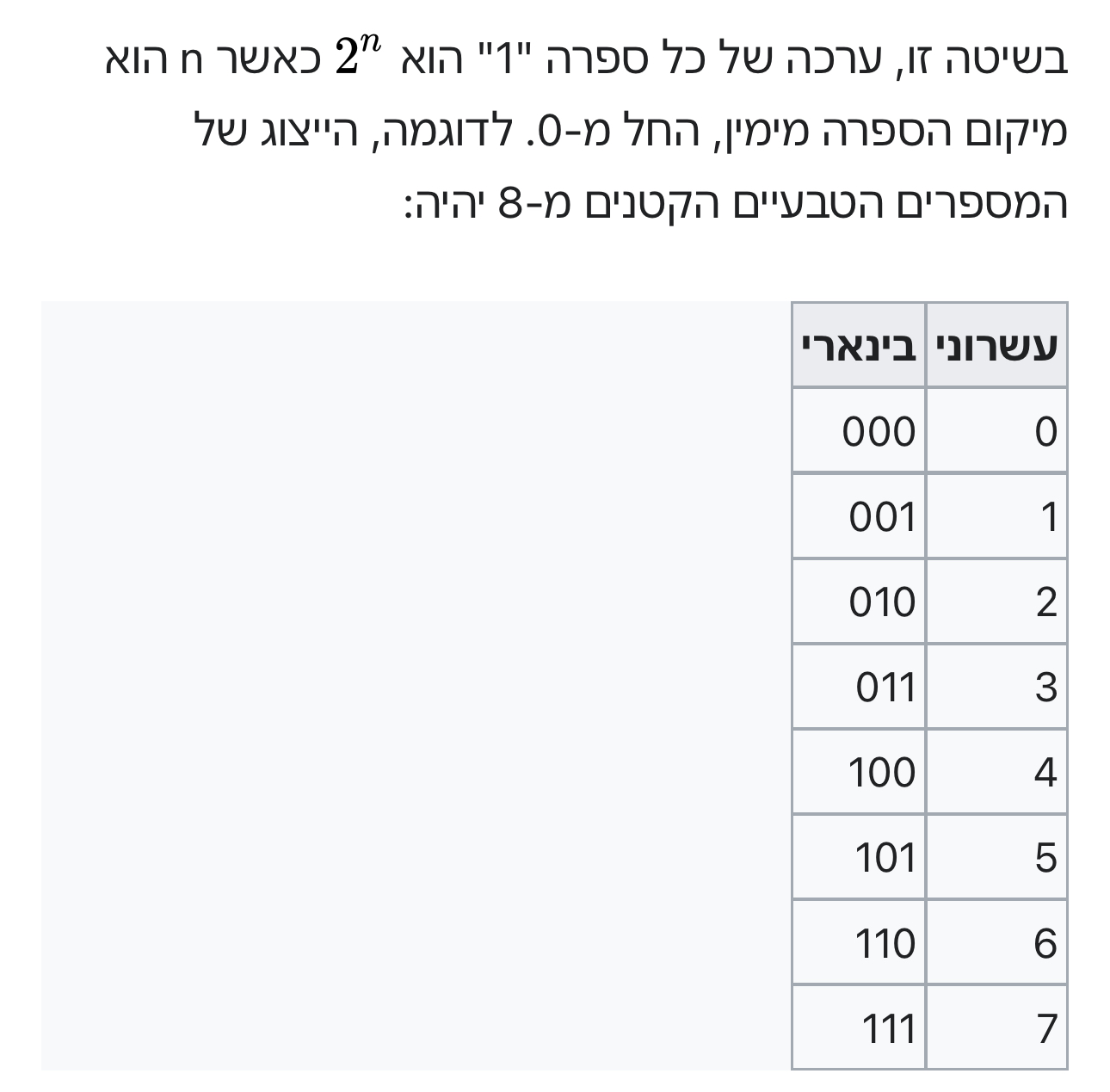 בשיטה זו, ערכה של כל ספרה "1" הוא 2 בחזקת n