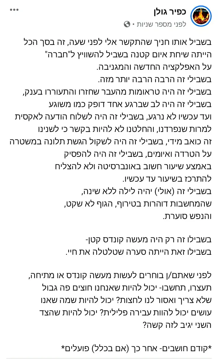 שעם ישראל יעריך אותנו קצת יותר. כמו שבאמת ראוי לנו כציבור. והחלקים השונים בציבור הדתי לאומי יוכלו לחיות קצת ביותר שלום והבנה, שהמחלוקות בינינו הן השקפתיות. ואיננו נלחמים נגד האדם, אלא נגד הדעה.