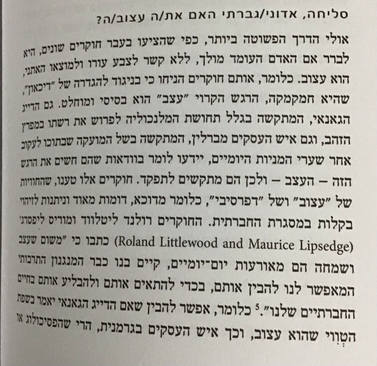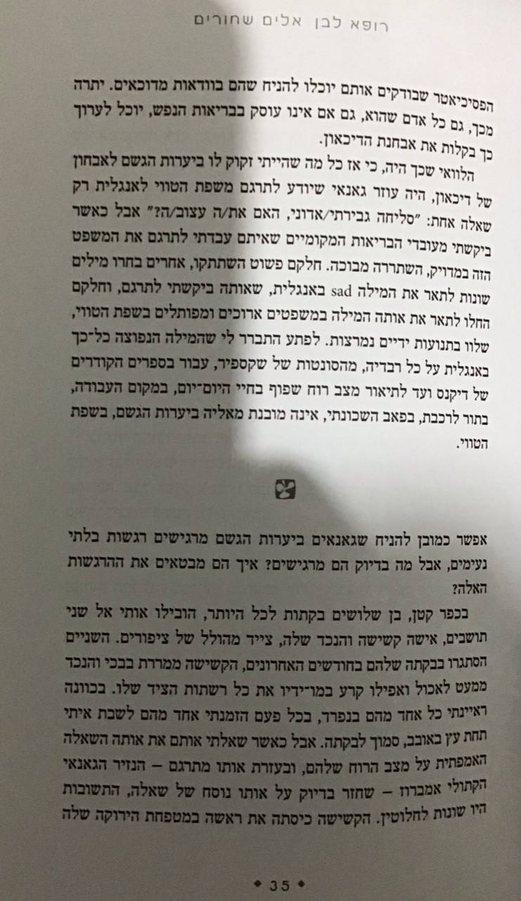 רציתי לשתף בקטע מעניין שקראתי. אין לי פואנטה מיוחדת, סתם מעניין. הרקע לקטע הזה הוא ניסיון שלו לבחון את השאלה עד כמה יש בדכאון מימד תרבותי תלוי חברה-מקום-זמן. ועד כמה אוצר המילים של שפה כלשהי לביטוי הרגשות משפיע על האדם המשתמש בו.