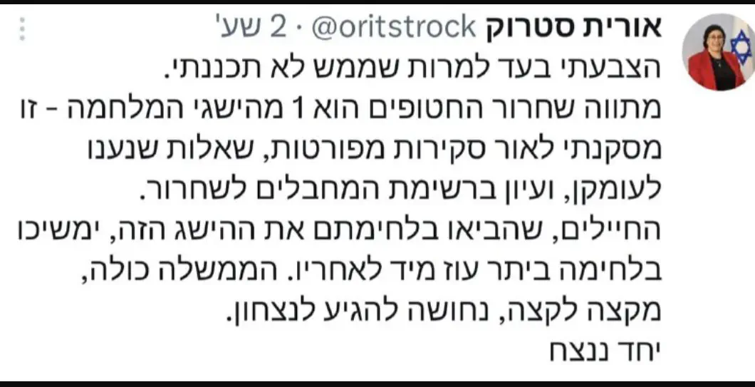 אבל באמת, אם אתה מסוגל להאמין לאורית סטרוק שבכירי הבטחון שכנעו אותה בהישגים שלהבנתם שינו משהו באפשרויות, ושהיא הצביעה בעד בגלל זה ולא בגלל שזה חישוב פוליטי, אז אתה הוא שצריך להסביר איפה ועד כמה אתה סומך על המערכת, אחרי שבעה באוקטובר.