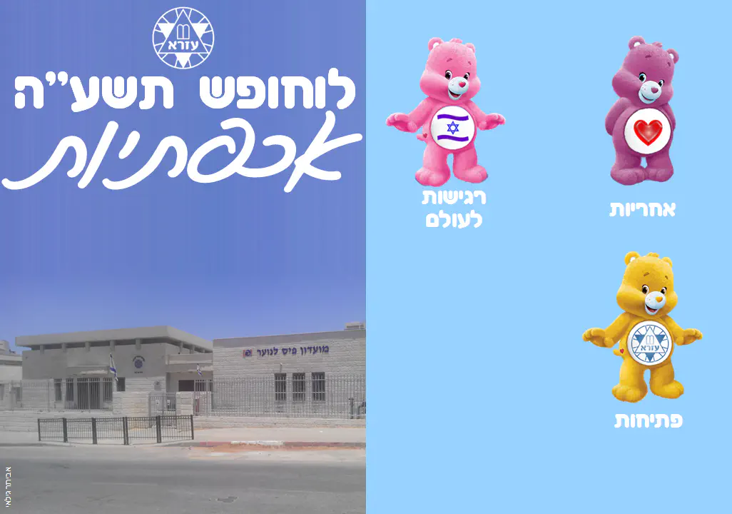 הטקסט הוא בפונט Choco, כשבאפשרות של עיצוב טקסט, כשלשורה העליונה יש מילוי טורקיז וזוהר בצבע כחול, לשורה הבאה מילוי לבן וצל פנימי, ולכיתוב האחרון מילוי לבן, קו טורקיז וצל חיצוני.