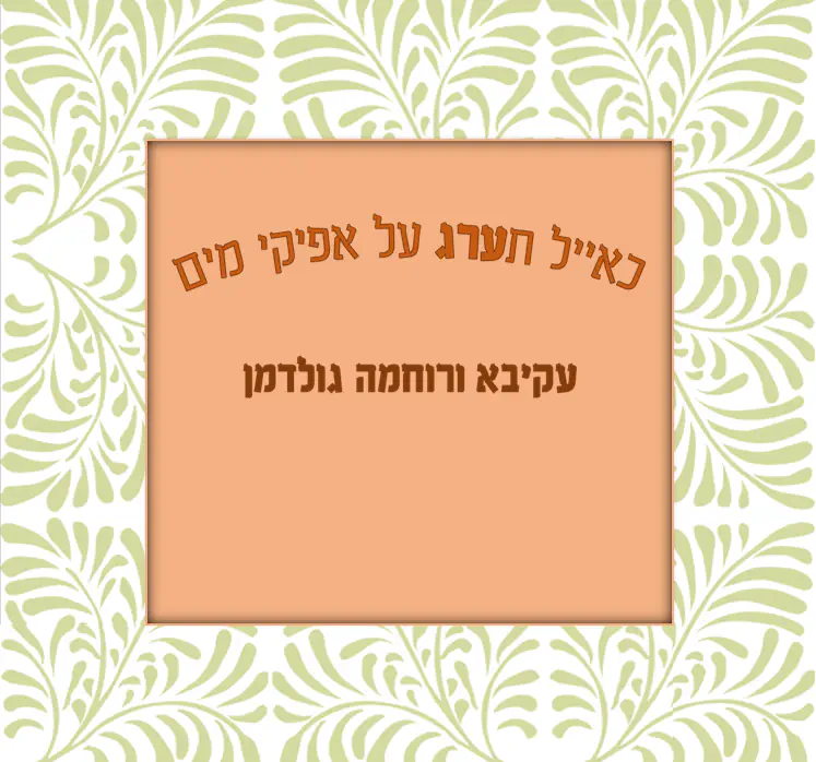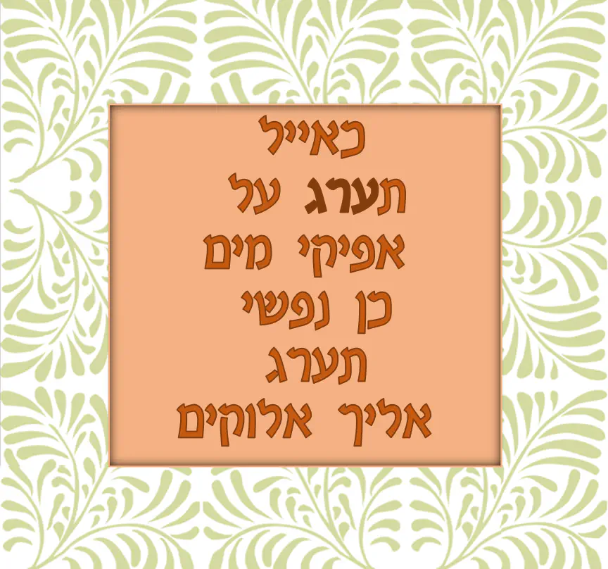 העיצוב אמור לכלול את הפסוק כאיל "תערג על אפיקי מים" כאשר האותיות המוגדלות פה אמורות להיות מודגשות בצורה כזאת או אחרת (ראשי תיבות של עקיבא רוחמה גולדמן) וציור מתאים (שני איילים שותים מנחל או משהו דומה)