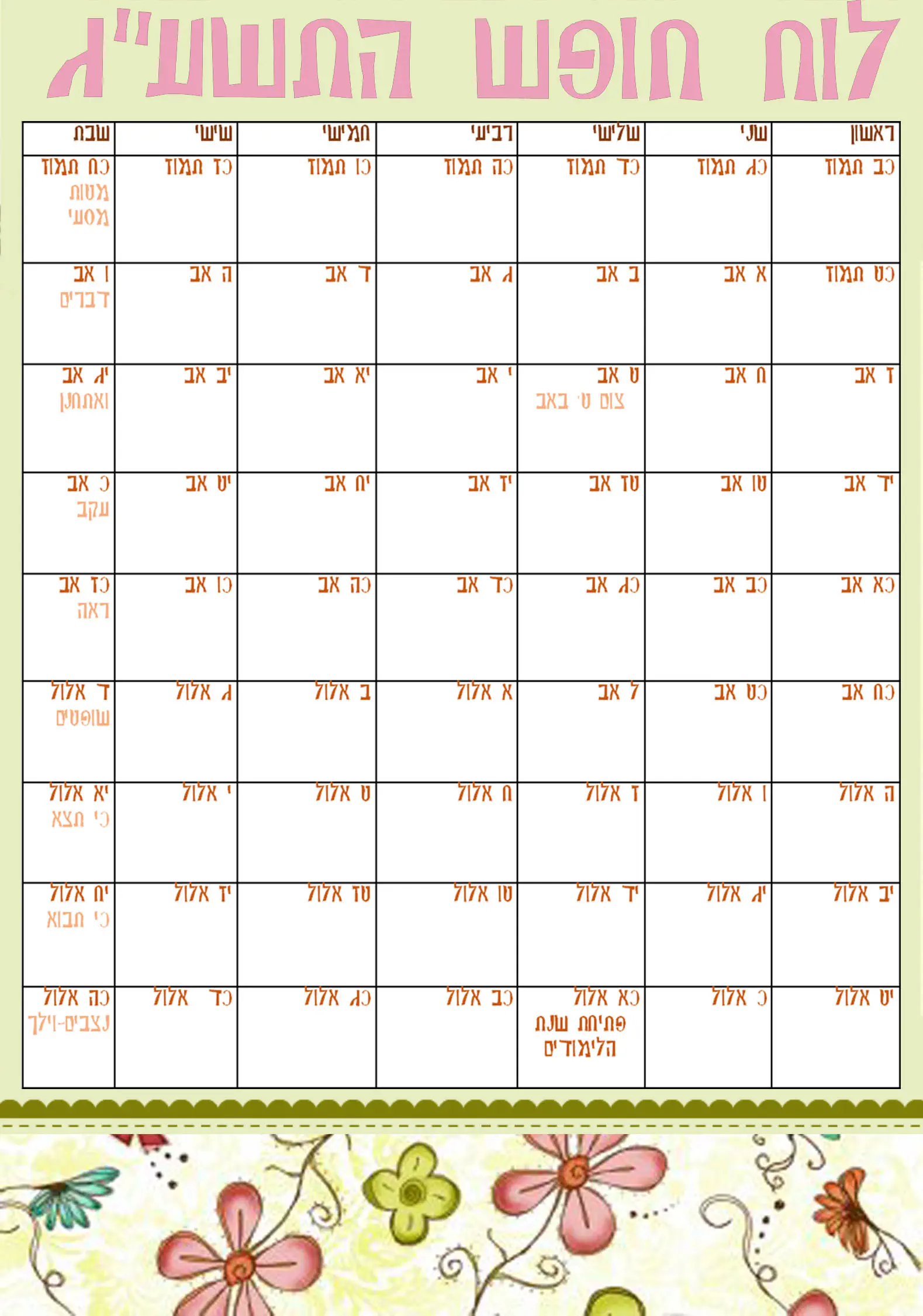 (עיצוב זה ל-א התחום שלי...) אני רוצה לוחופש בword (כדי שאני אוכל לשנות), מעוצב, עם תאריכים עברים ולועזים וע-נ-ק (כדי שיהיה אפשר לכתוב בפנוך דברים ויהיה מקום. לא משנה אם זה מתפרש על כמה עמודים...) תודה ותמשיכו עם העבודה הטובה!!!!