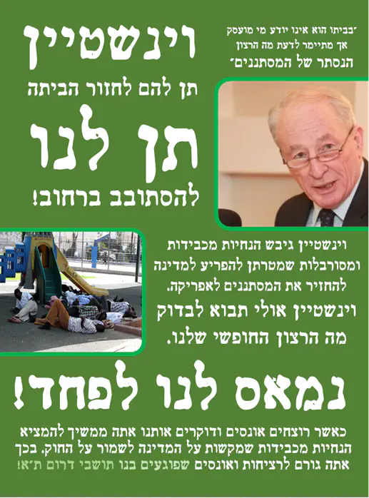 * הייתי ממליץ לך לשנות את הנוסח של הפלייר ליותר תקיף. במקום "להתחנן" לוינשטיין, לדרוש ממנו! ולא לדרוש שייפעל למען החזרת המסתננים, אלא לדרוש שייבטל את ההנחיות המכבידות שלו, כי הוא לא סתם גיבש אותן! הוא עשה את זה בכוונה, ועל זה צריכה להיות המחאה. הוא לא עשה את זה סתם כי בא לו! (ראיתי בוויקיפדיה מה הוא עשה...) הוא פועל בעד המסתתנים, ולא נגדם! כל עוד סודנים לא יאנסו את הבת שלו, הוא לא יבין מה זה! וגם אם יבין - לא בטוח שזה מה שישנה את דעתו! במקום לבקש רחמים מהאדם המושחת הזה, צריך להוכיח אותו! ולפרסם את כל ההנחיות שלו, כדי שאנשים יראו ויבינו על מה אתם (וועד הפעולה) מוחים! והפלייר הזה צריך להיות רק יריית פתיחה למאבק הגדול שצריך להיות, שהפליירים הבאים יהיו עם הפרטים של הקמפיין, (כתובות אימייל, פייסבוק וכו'...) שהמטרות שלו שכל המדינה תדע על זה! בנוסף, ממולץ לפתוח עצומה באתר "עצומה", ותראה שאלפי אנשים יחתמו עליה! כל חותם הוא תומך במאבק! את כתובת האינטרנט של העצומה צריך לפרסם בפליירים ובמודעות הרחוב!אם במחאת הקוטג' ובמחאת רוטשילד זה עבד - אין שום סיבה שעכשיו זה לא יעבוד! (רק אם מנהלים את הקמפיין כמו שצריך!) מודעות ופליירים לא יעשו את העבודה לבד! צריך להשקיע מאמץ - הפגנות ענק בכל הארץ, צעדות, שלטים עם המוטו: "וינשטיין! תן להם לחזור הביתה, תן לנו לצאת מהבית!" ובסוף רק תרוויחו מזה. זה בשבילכם! מחאה על מסתננים בת"א, באילת, וגם בירושלים יותר חשובה ממחירי קוטג'! אם יהיה לכם את האומץ לנהל מאבק גדול ורציני, שייעלה את הנושא על סדר היום יותר משהיה אי פעם, בדרישה להחזיר את כל המסתתנים, עד האחרון שבהם - זה יעבוד! כל המדינה תתצרף אליכם, ותמחה איתכם ביחד! אסור לתת למצב הזה להמשיך! רק נזקים המסתננים גורמים! אני גר באיזור ירושלים, אבל יצא לי לעבור באוטובוס בדרום ת"א, וחשכו עיני! (תרתי משמע..) אני מאוד נבהלתי, ואני לא יודע איך אתם, תושבי ת"א מתמודדים עם זה כל הזמן! דבר ראשון - אני מצדיע לכם על הנחישות במאבק הצודק שלכם, דבר שני - תיכנסו לזה בכל הכוח, דווקא עכשיו, כשהמדינה עסוקה בכל מיני נושאים אחרים, צריך להעלות את הנושא הזה, וזה מאוד חשוב. צריך להבהיר לכל אזרח במדינה שהבעייה לא חלפה, ויש עוד סכנה להסתובב חופשי ברחובות ת"א! יישר כח! ותודה על הסבלנות... ![]()