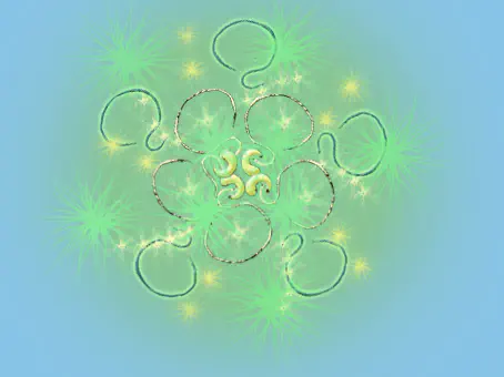 ציור בצורה מעוגלת. האמצע הוא המרכז, וממנו מתפתחים דברים נוספים, בצורה שחוזרת על עצמה.