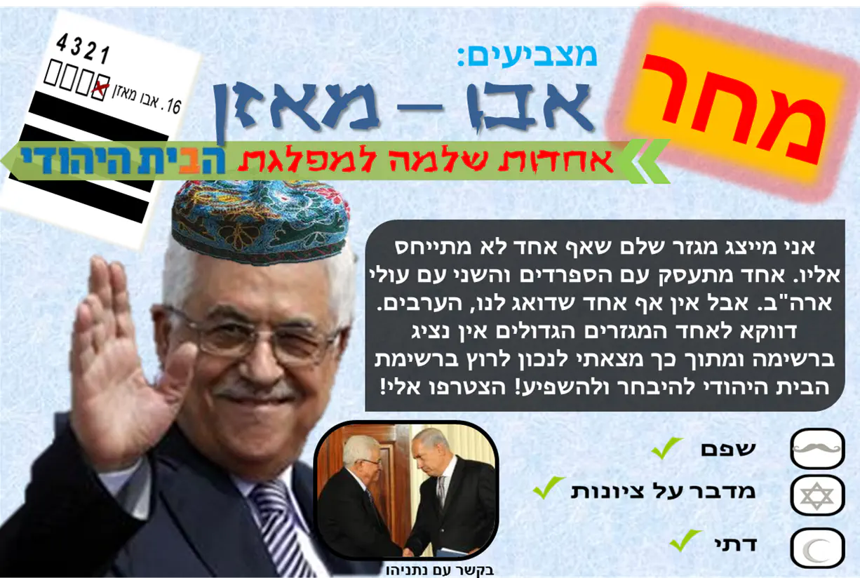 אם בא לך בכל זאת שזה יהיה יותר יפה, הכיפה של אבו מאזן נראת יותר מדי מודבקת, ומשו במסגרת של ה"מחר!" קצת לא נעים לעין... אבל בסך הכל זה נראה כמו פרסומת בחירות
